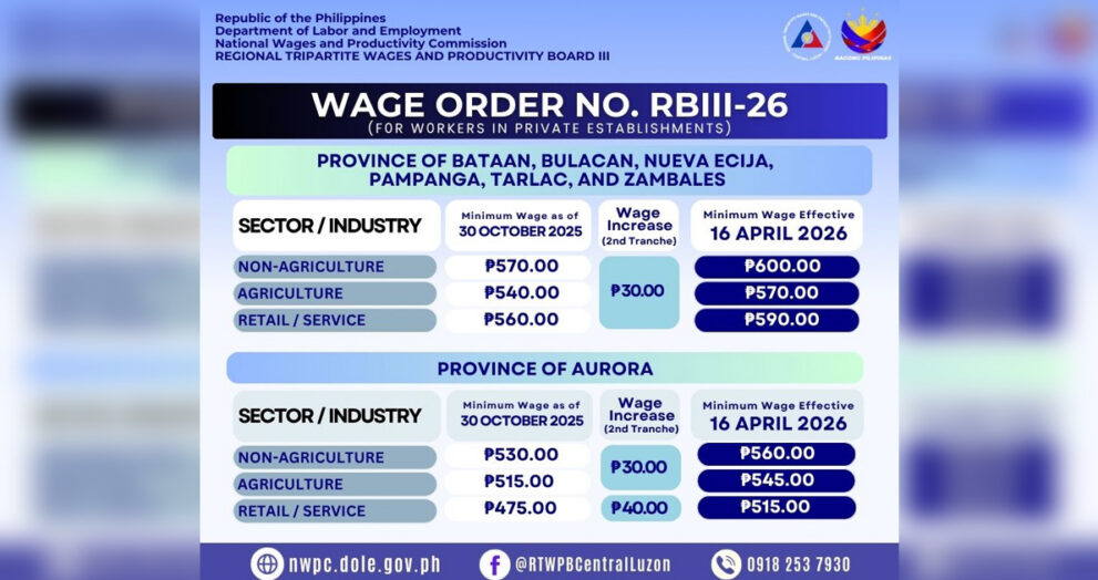 Magsisimula sa Abril 16, 2026 ang ikalawang tranche ng Wage Order No. RBIII-26 ng Regional Tripartite Wages and Productivity Board III (RTWPB 3), na magdadagdag ng ₱30 hanggang ₱40 sa arawang sahod ng mga manggagawa sa pribadong sektor sa Central Luzon.   Ayon sa wage order, kabuuang ₱50 hanggang ₱80 ang umento na ipinatutupad sa […]
