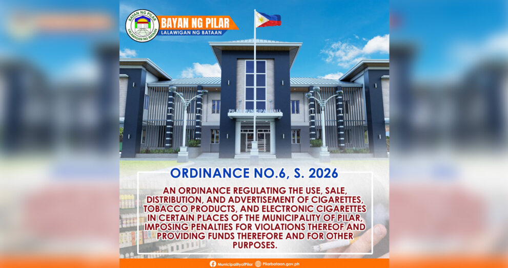 Naghigpit ang pamahalaang-bayan ng Pilar laban sa paninigarilyo upang mapangalagaan ang kalusugan ng mamamayan.   Ang kampanya na nakapaloob sa Municipal Ordinance No. 6, s 2026 ay nagbabawal sa paggamit, distribusyon o pagbebenta ng tobacco products at e-cigarettes sa bayan ng Pilar.   Ang mga lalabag sa naturang ordenansa ay papatawan nang kaukulang parusa at […]