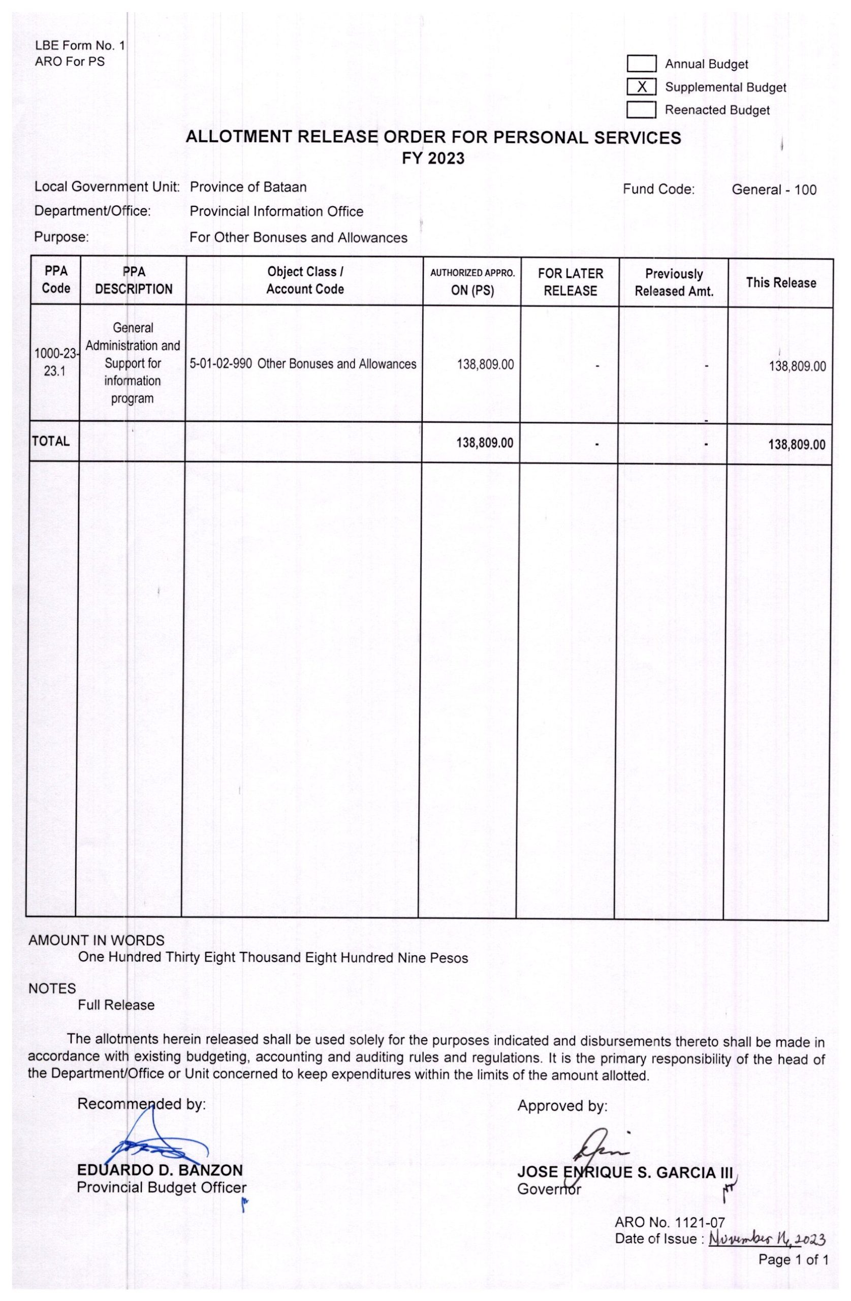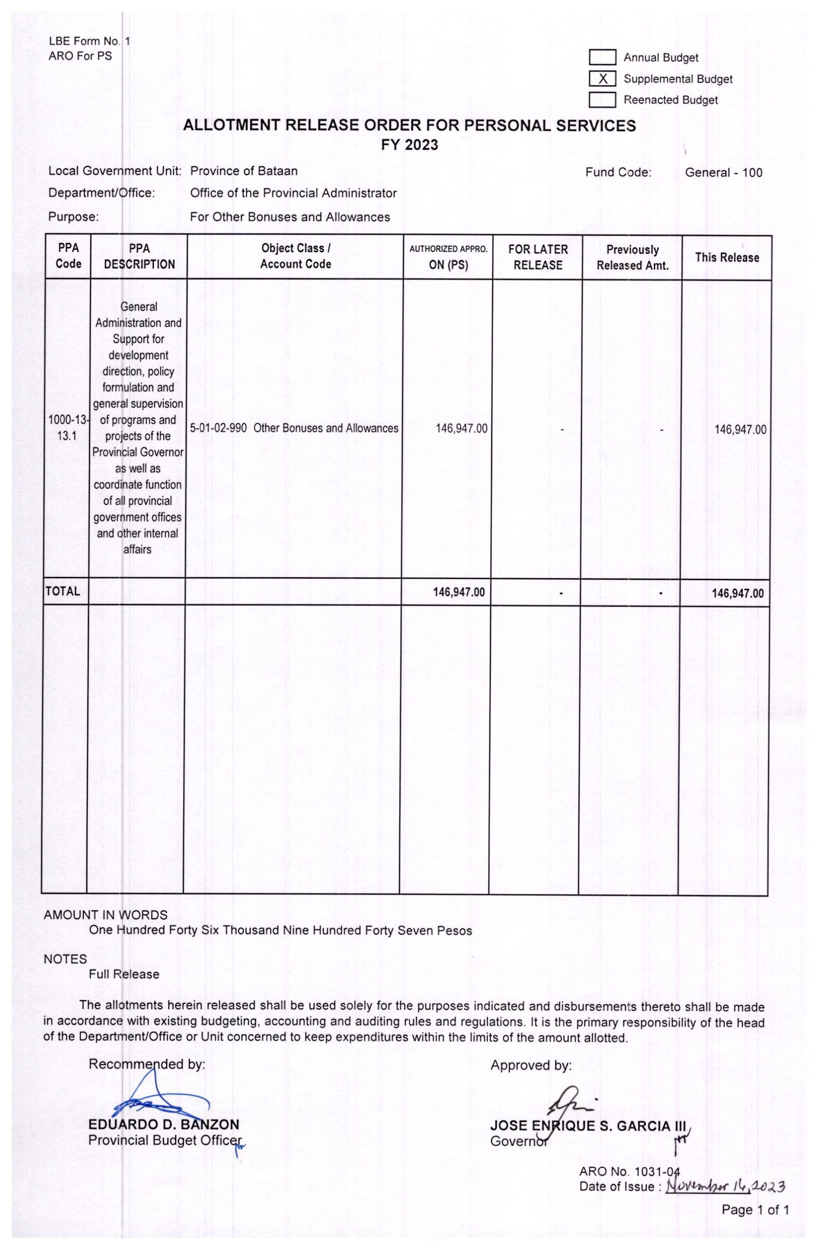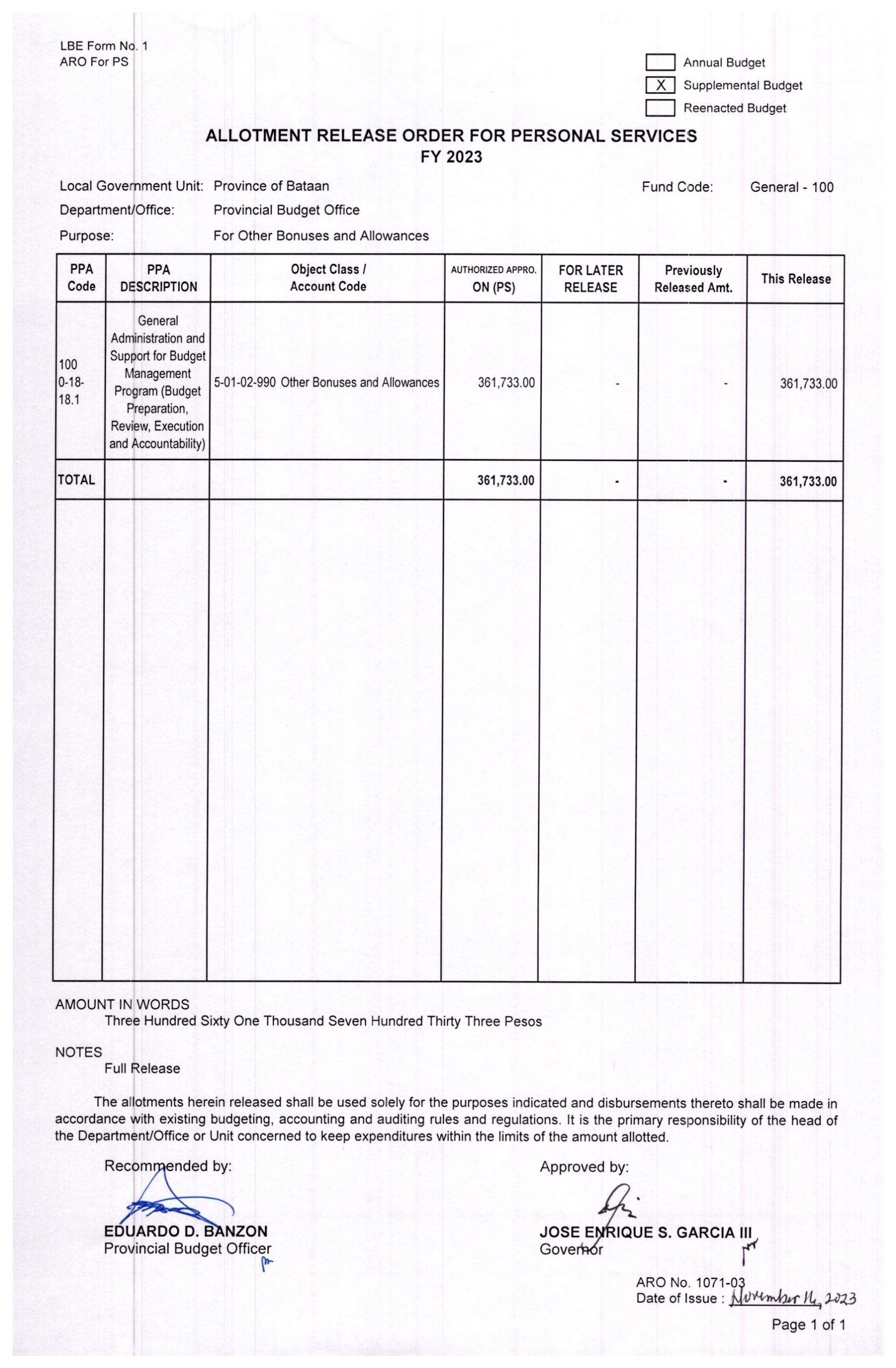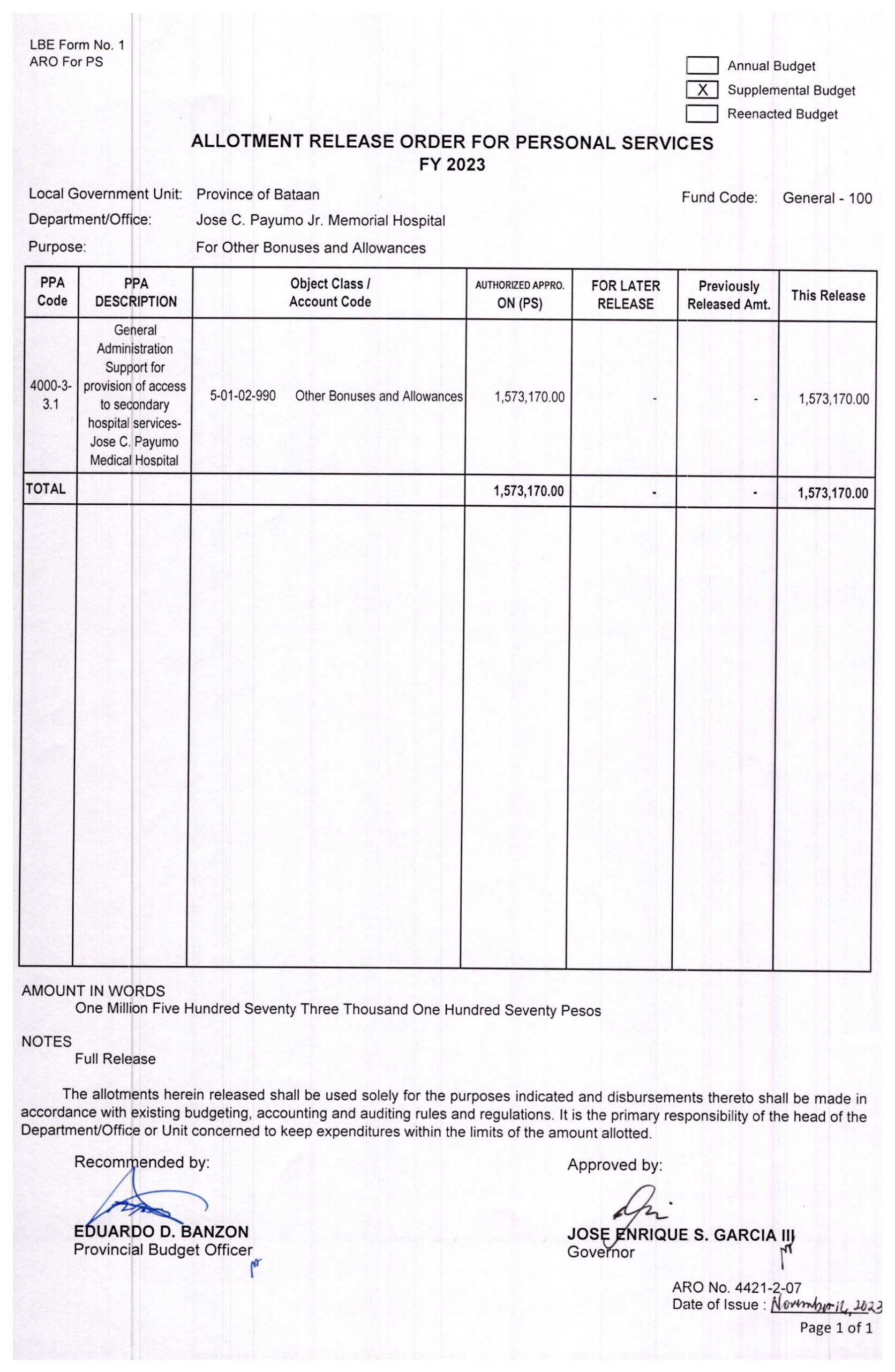 Allotment Release Order FY 2023