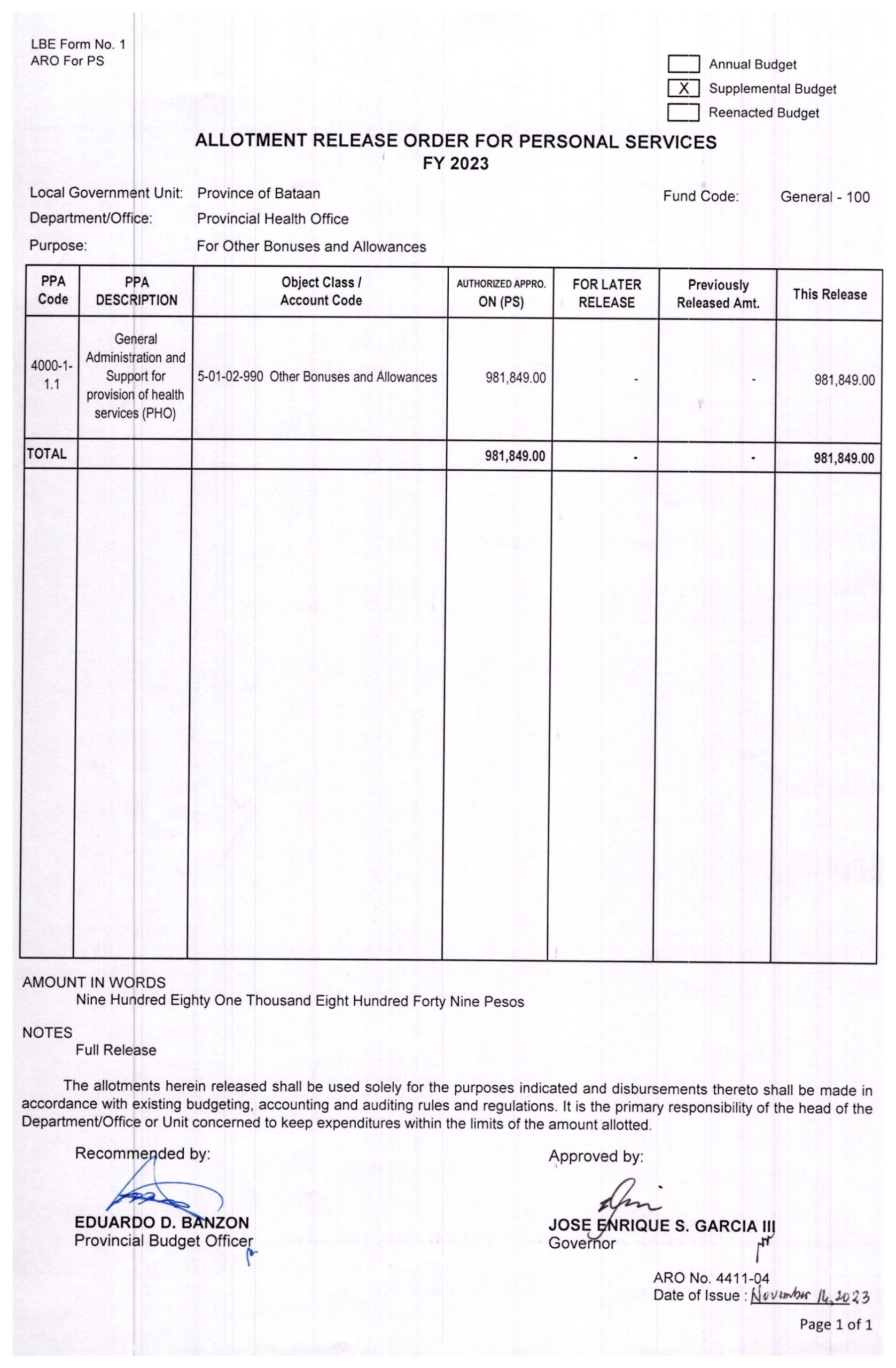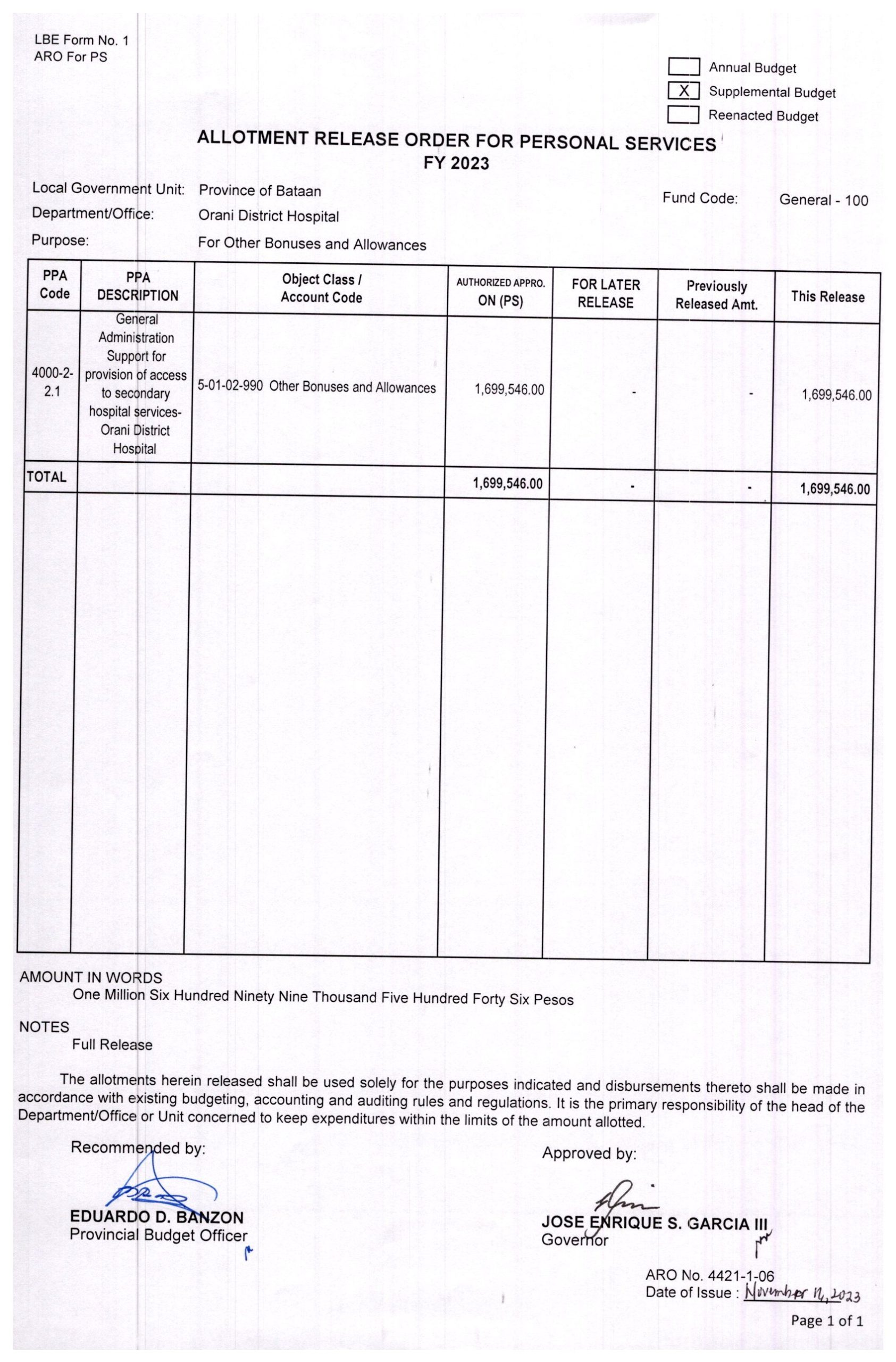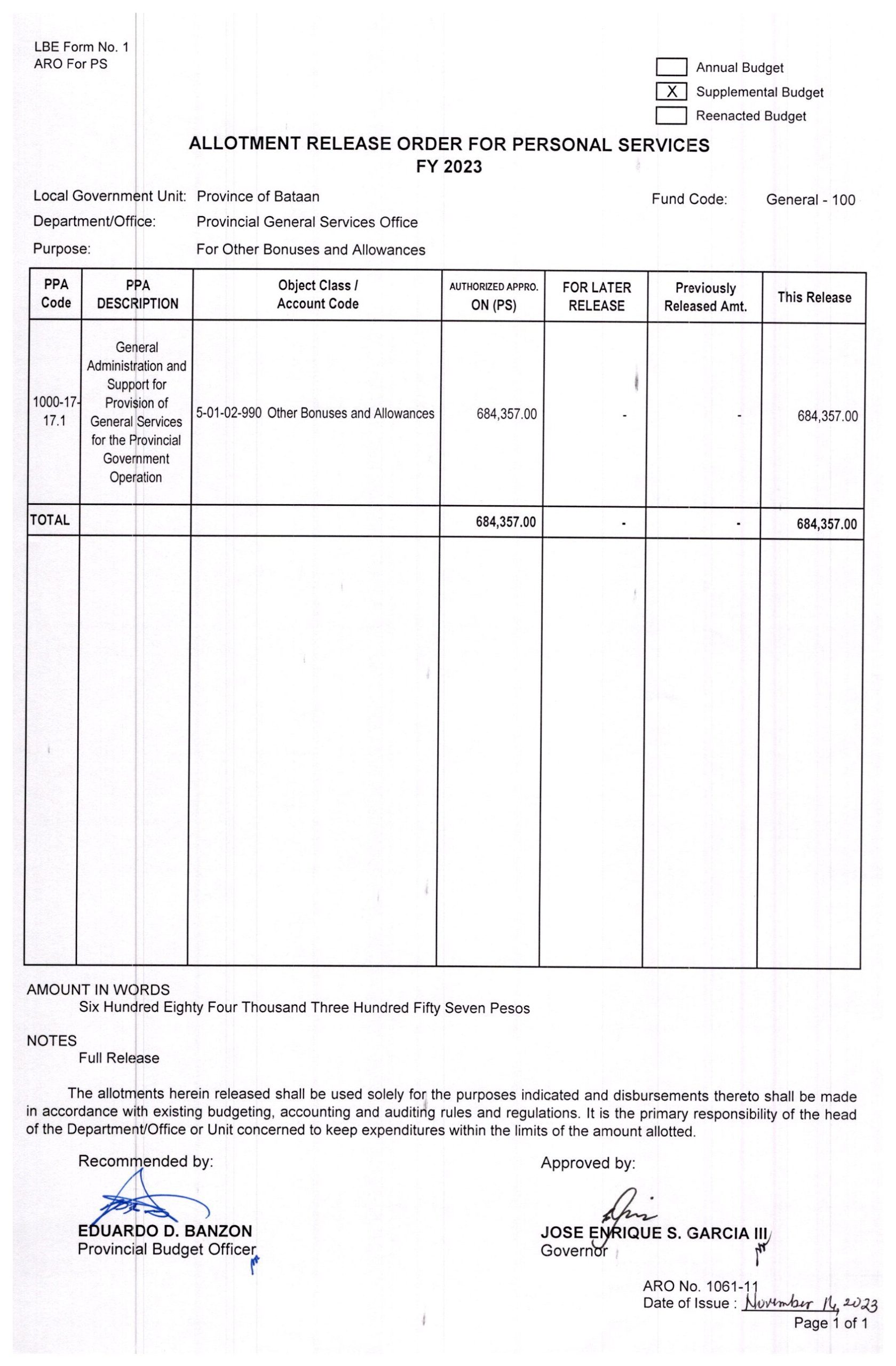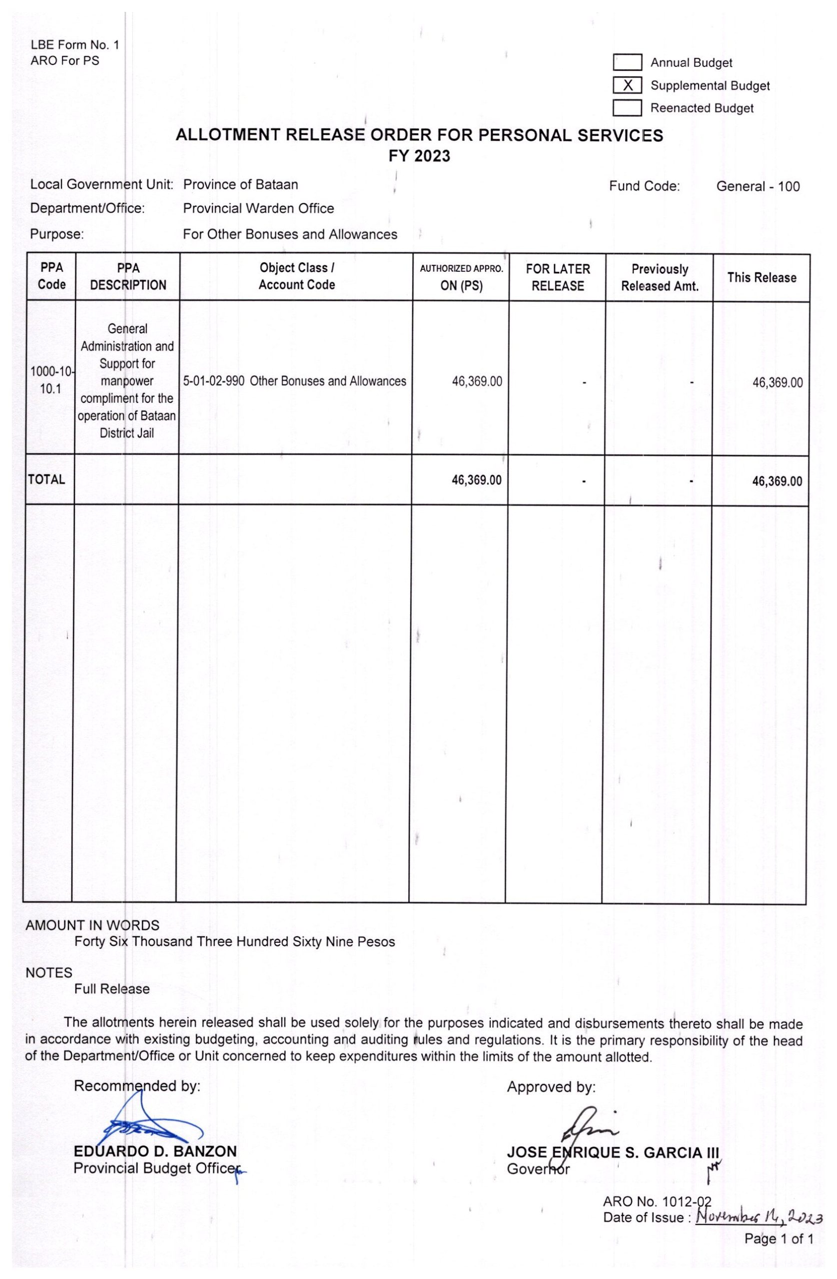 Allotment Release Order FY 2023