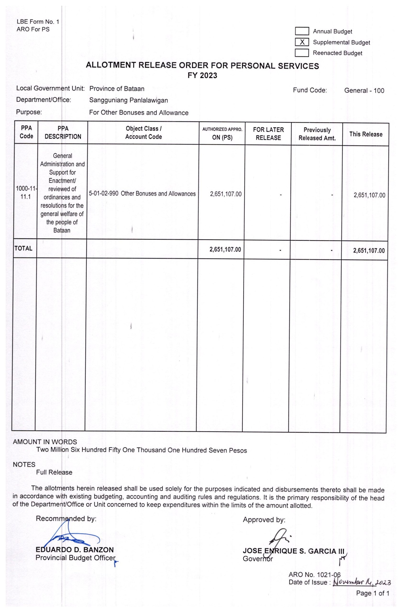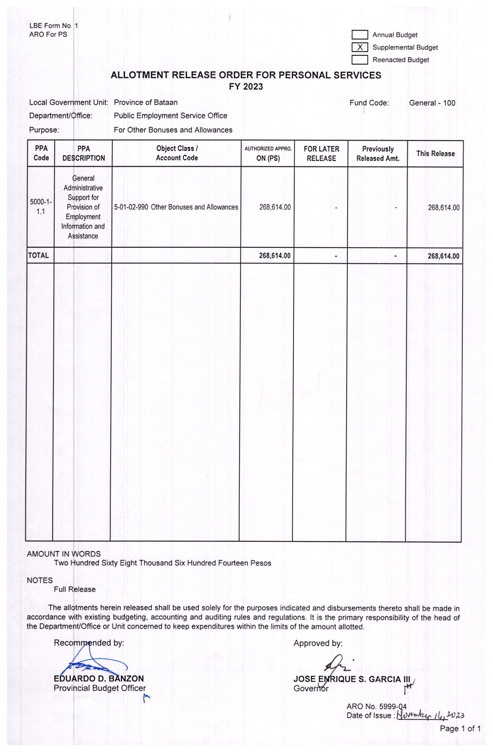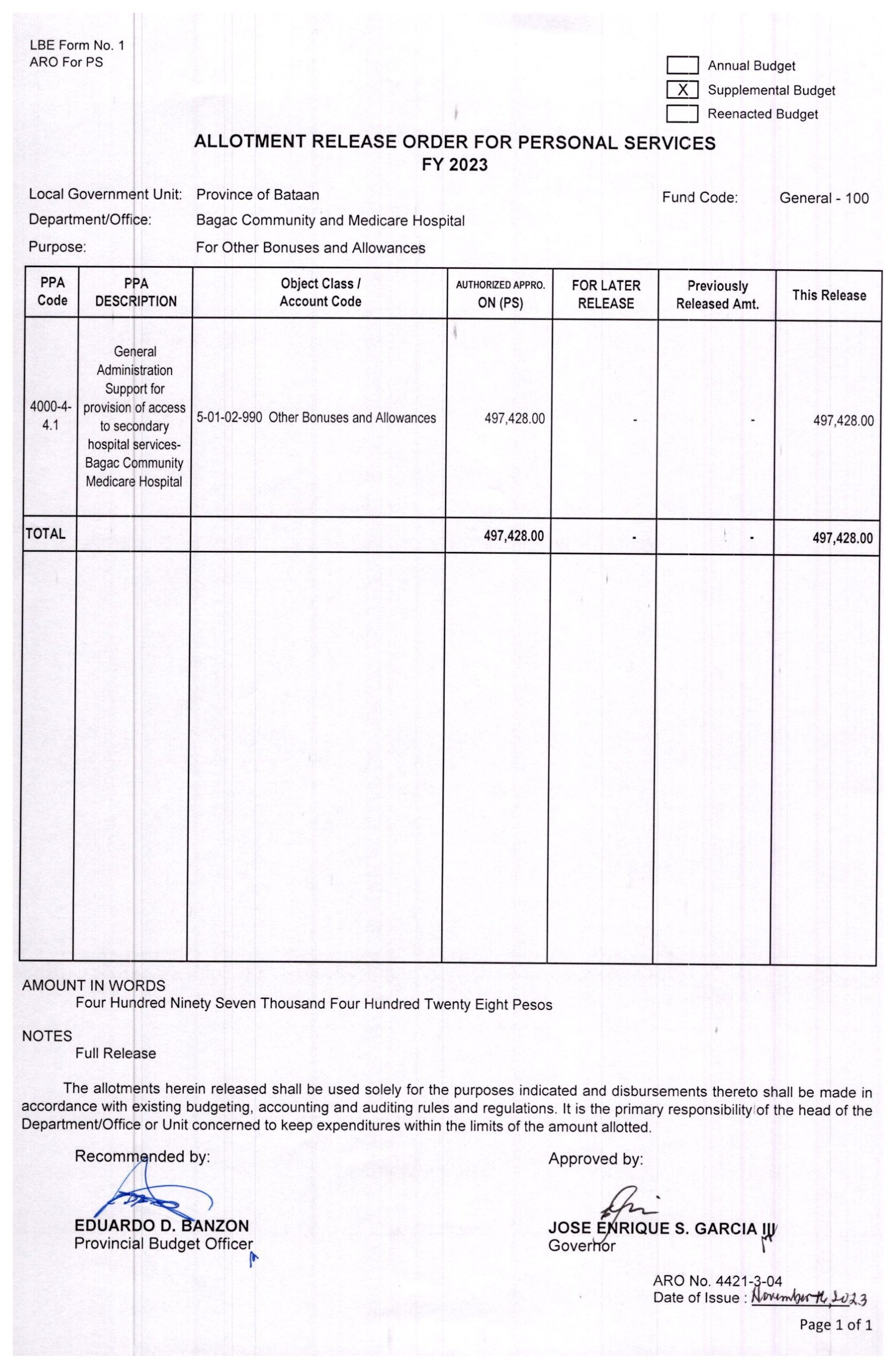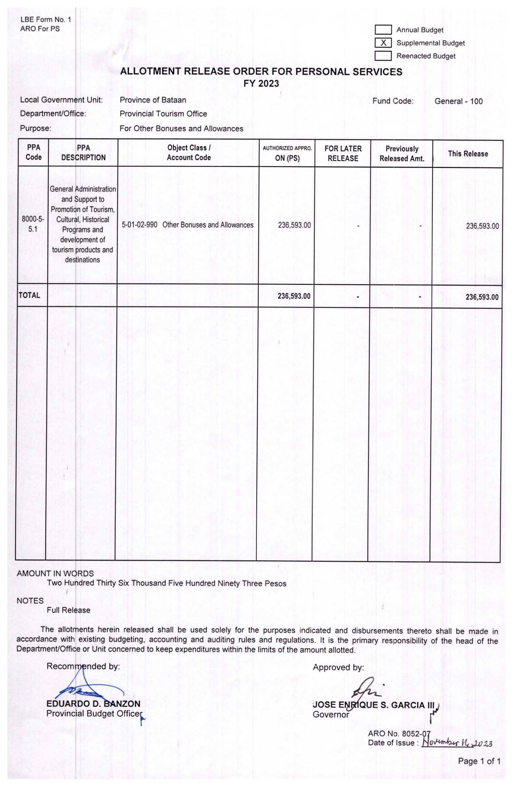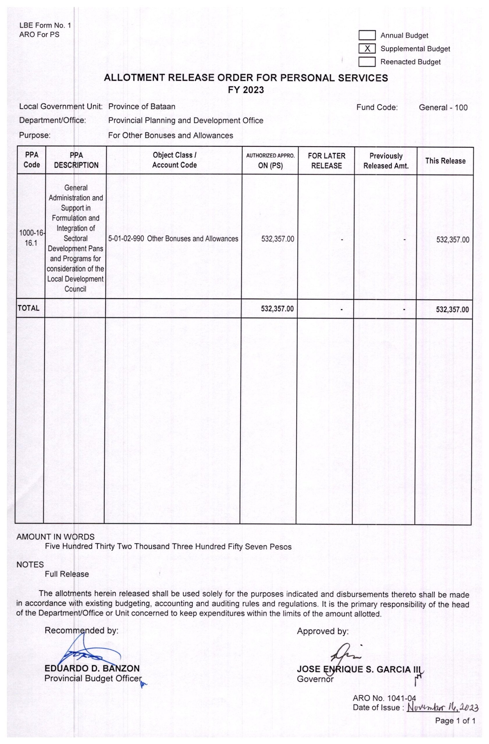 Allotment Release Order FY 2023