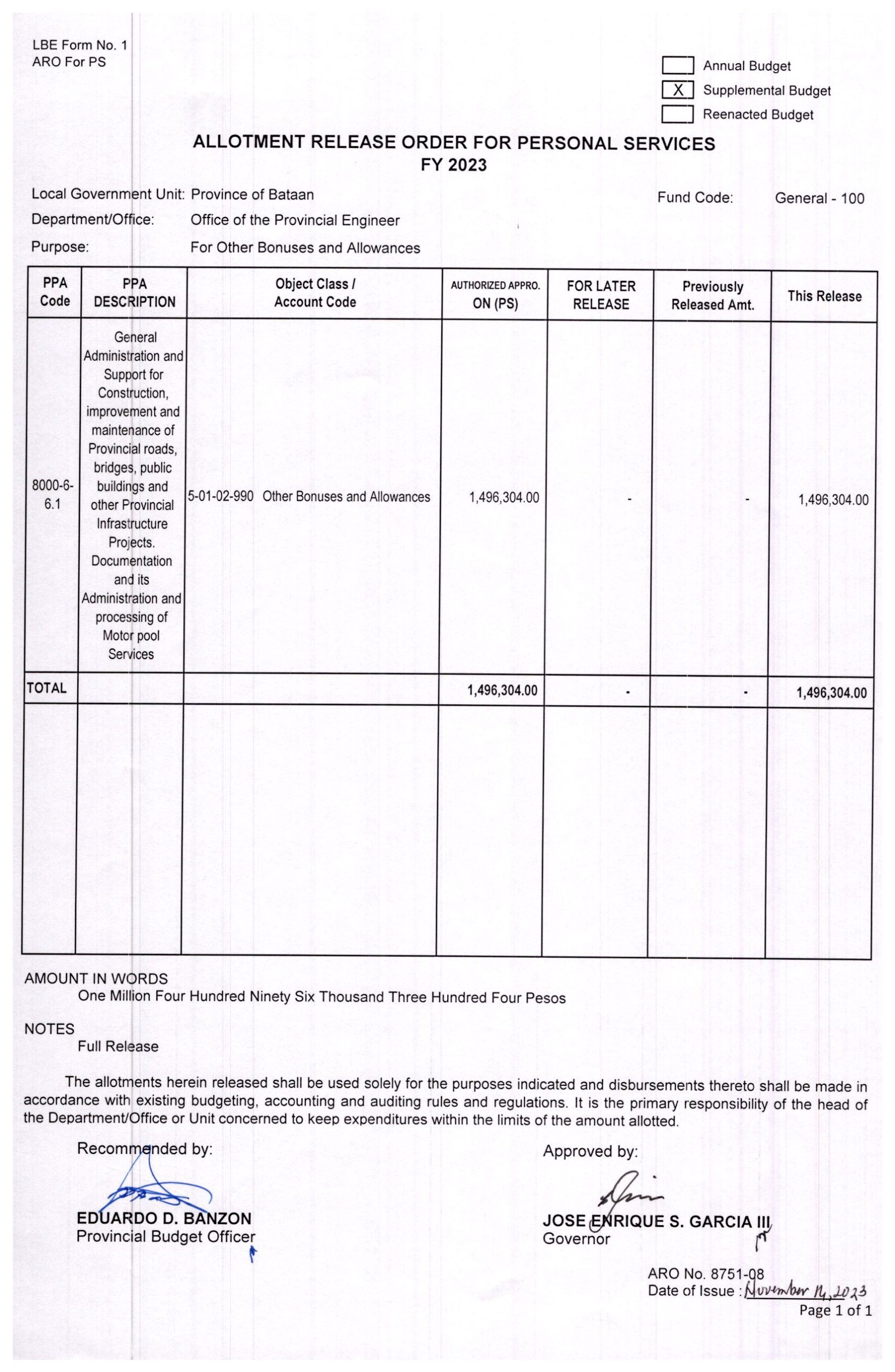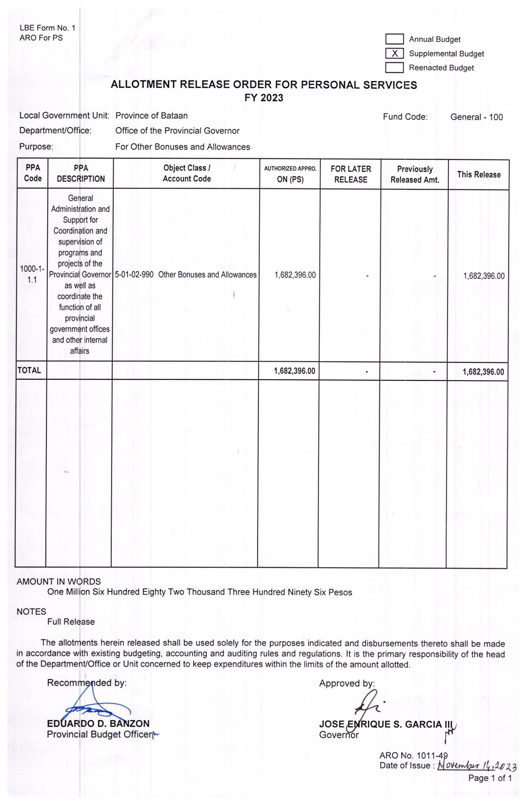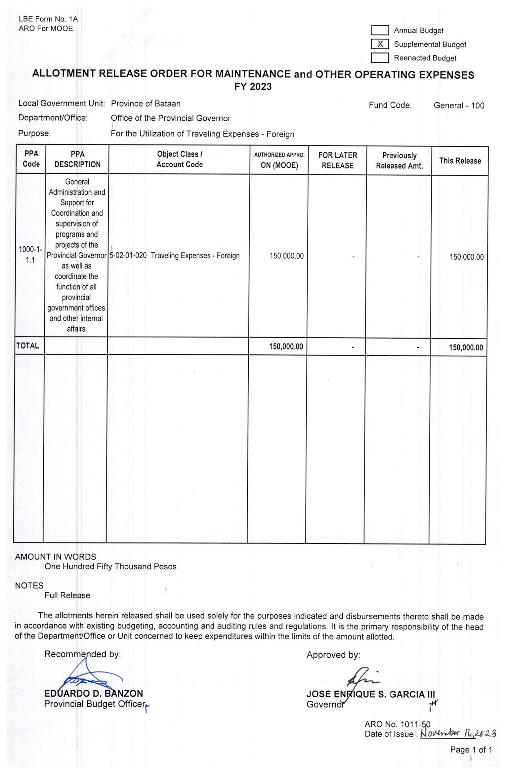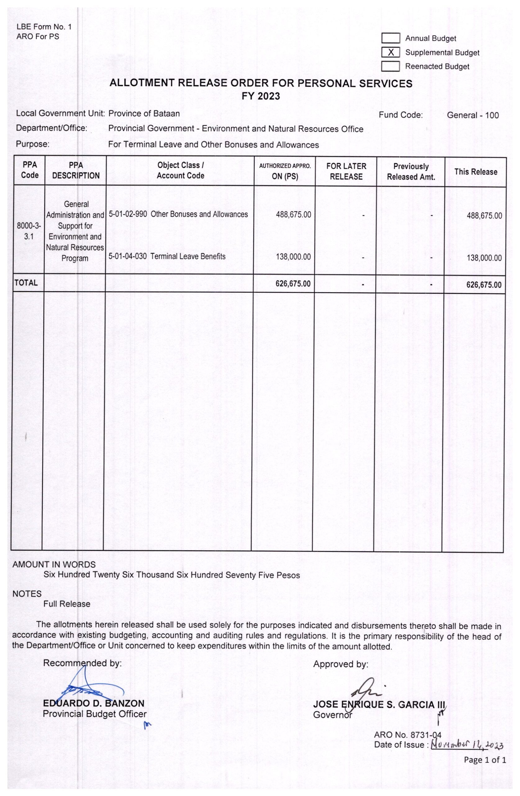 Allotment Release Order FY 2023