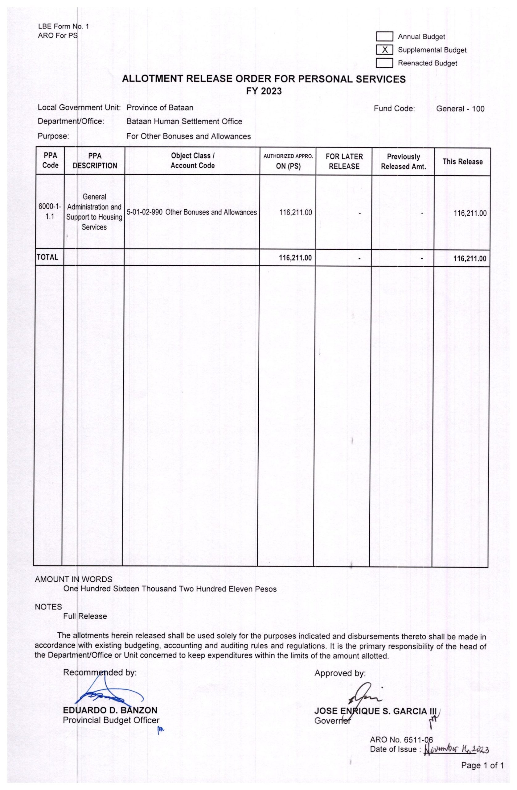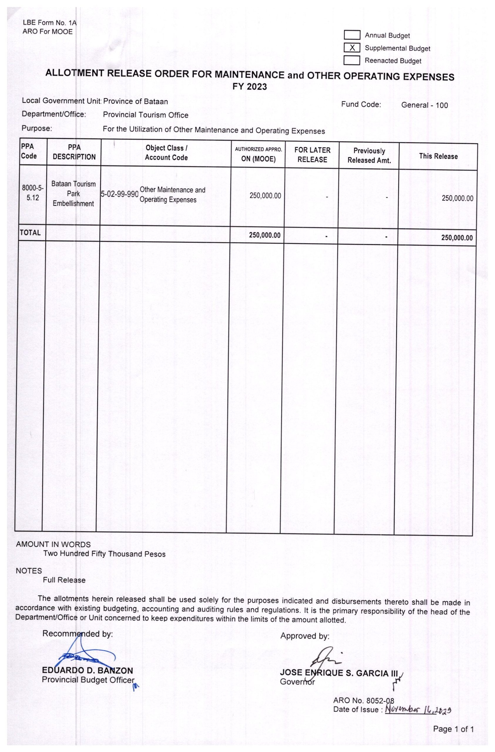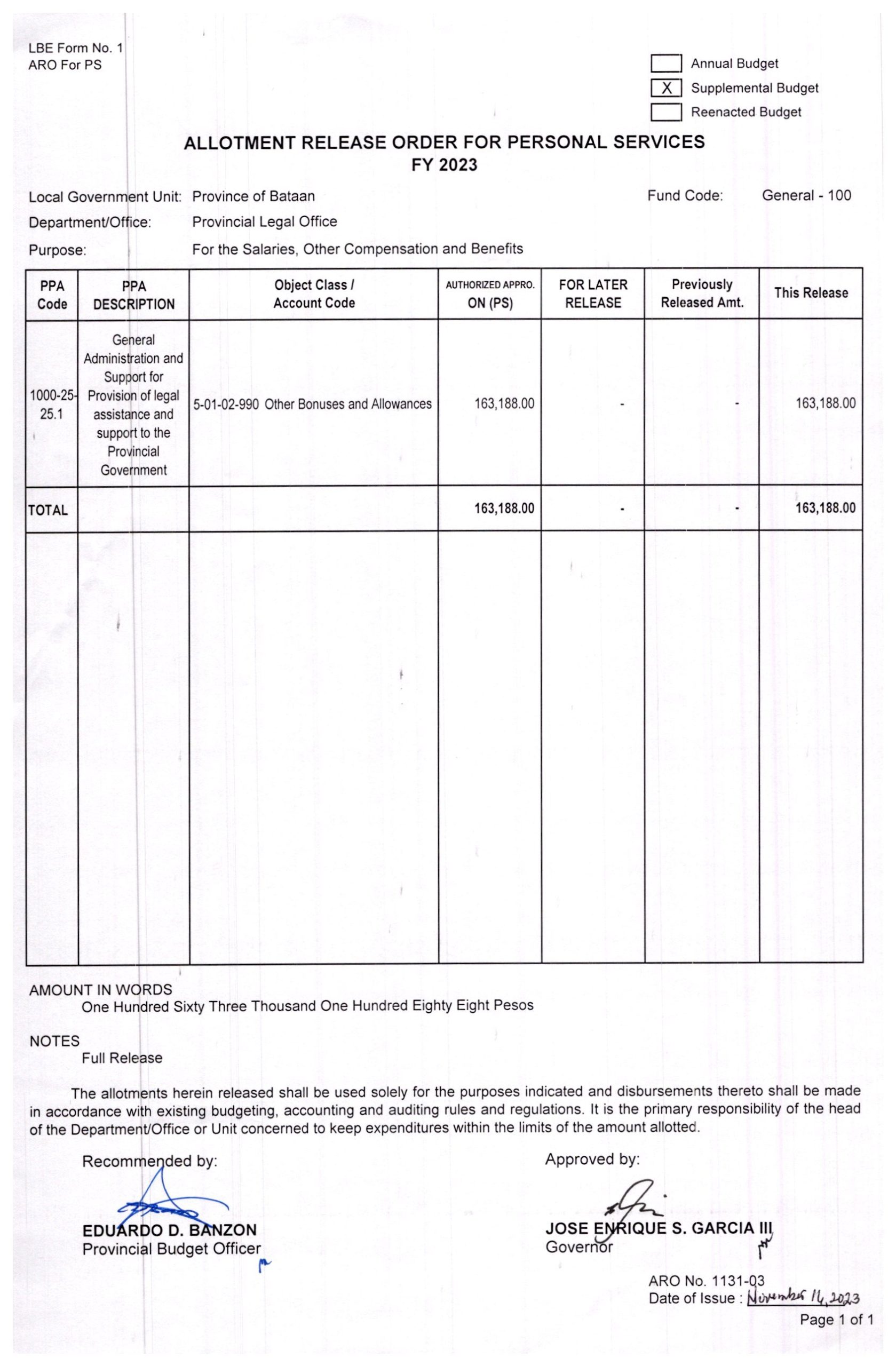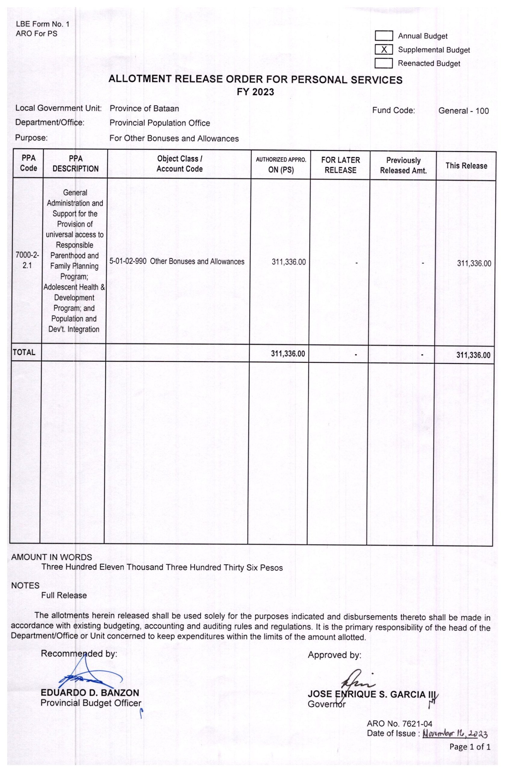 Allotment Release Order FY 2023