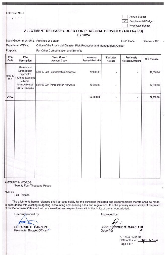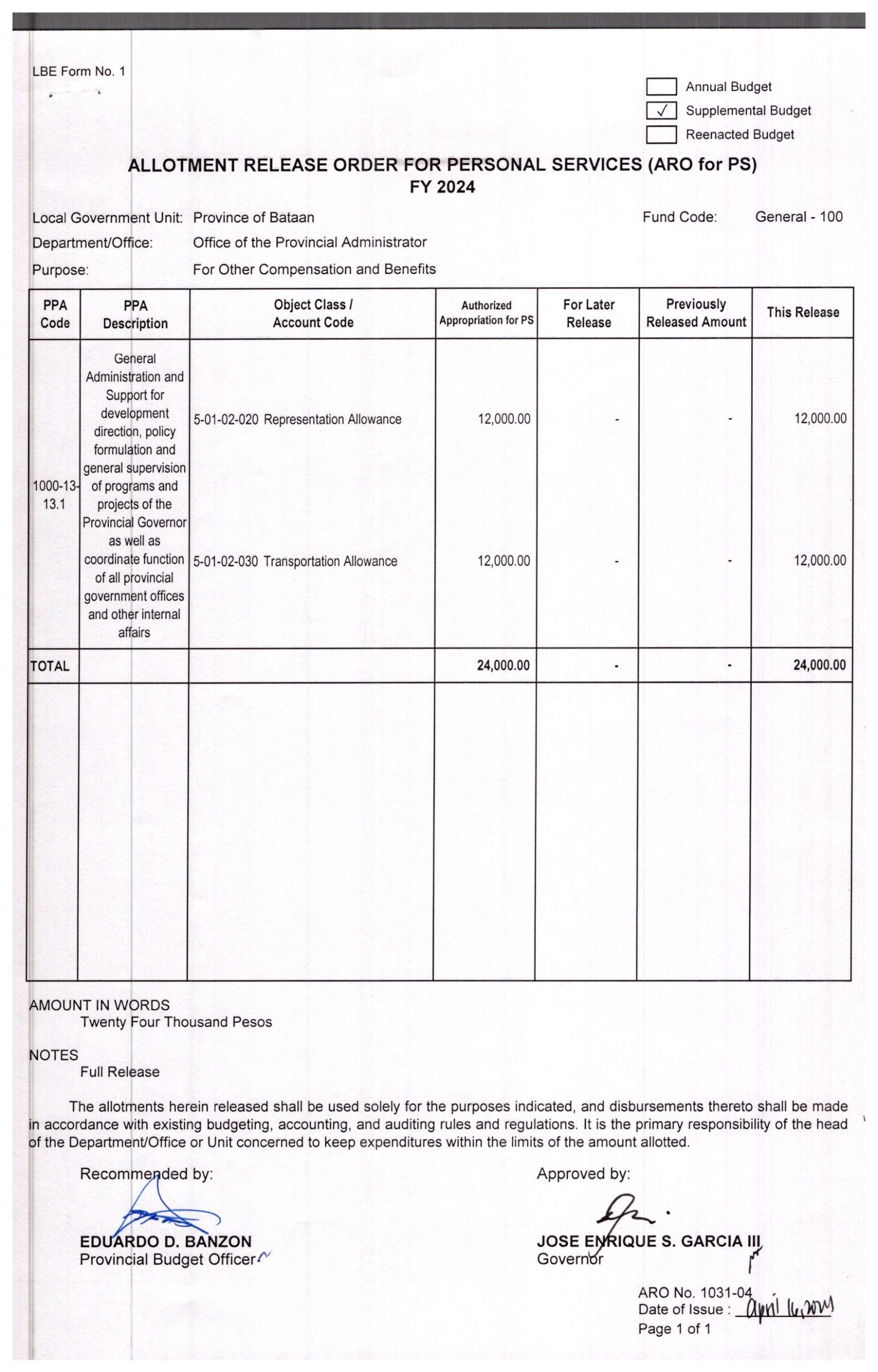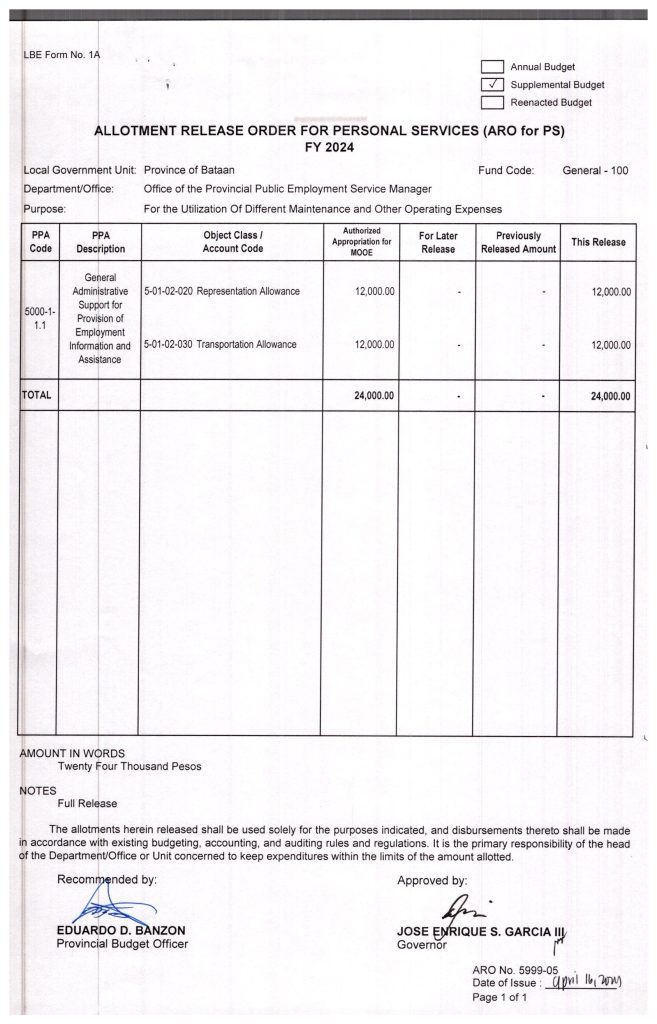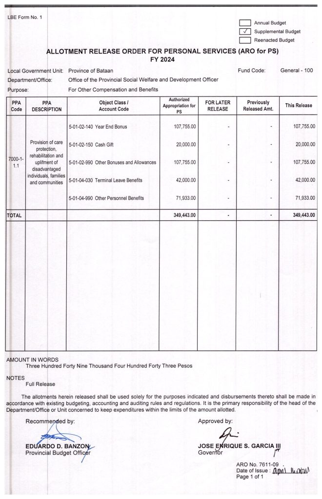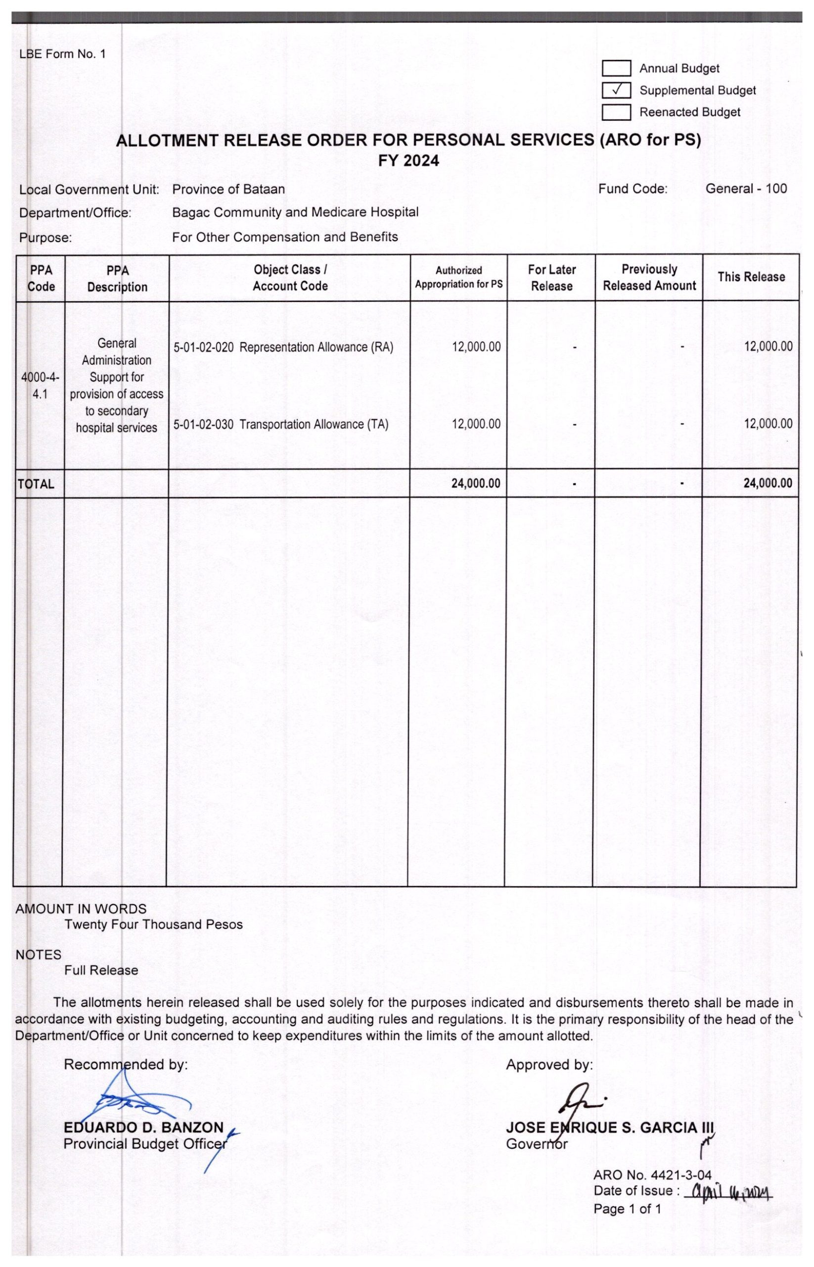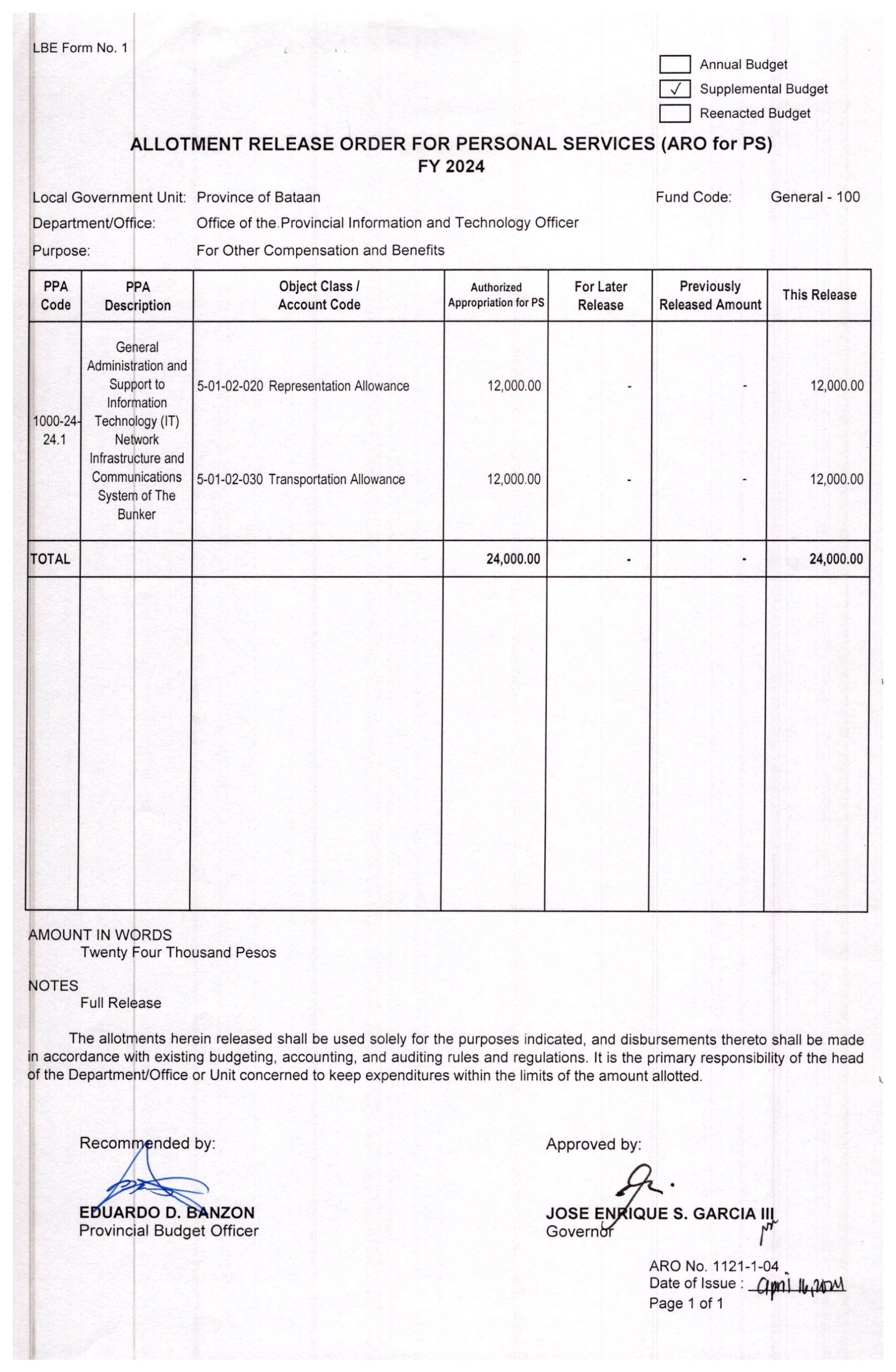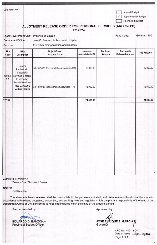 Allotment Release Order FY 2024 of Supplemental Budget No.2 FY 2024