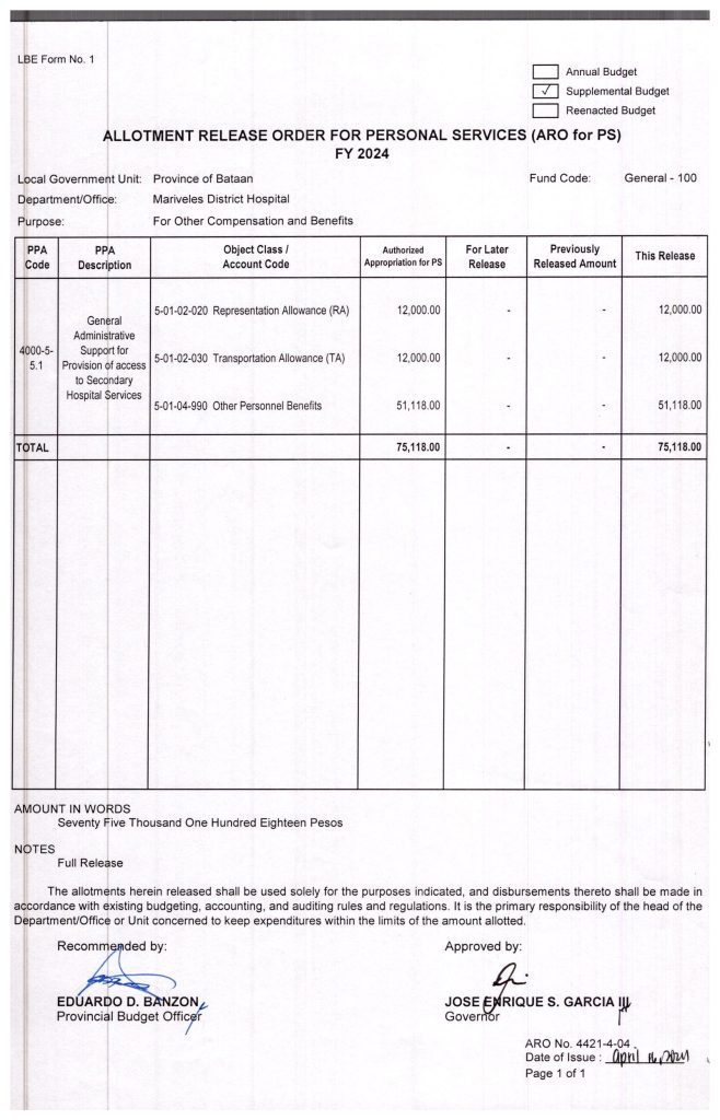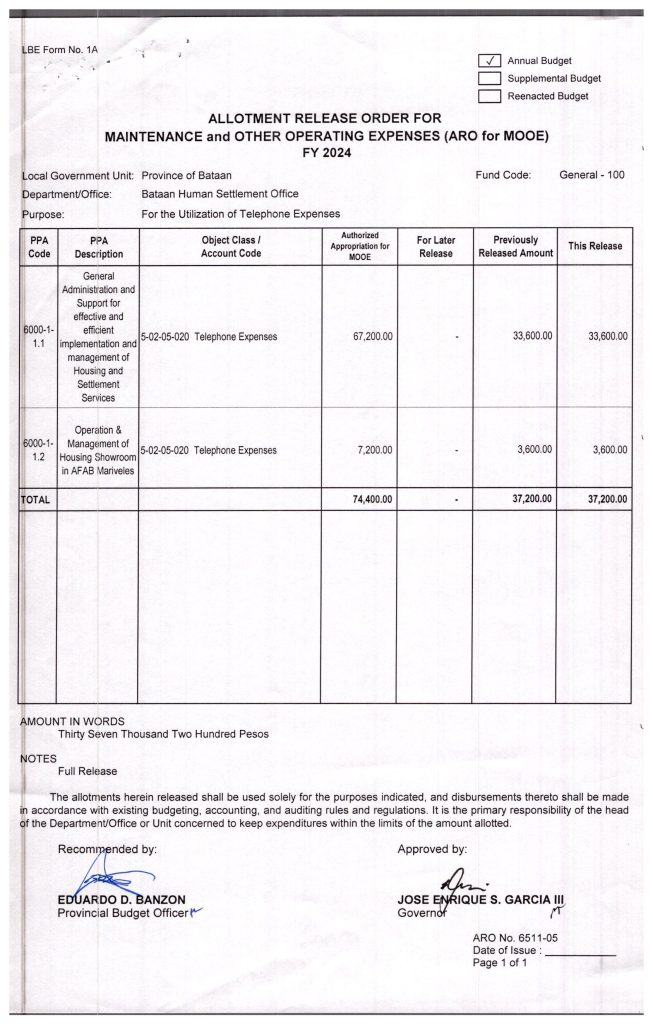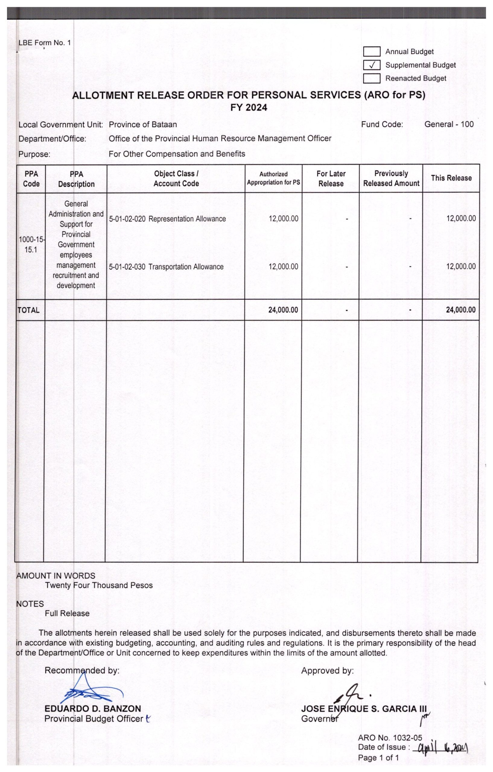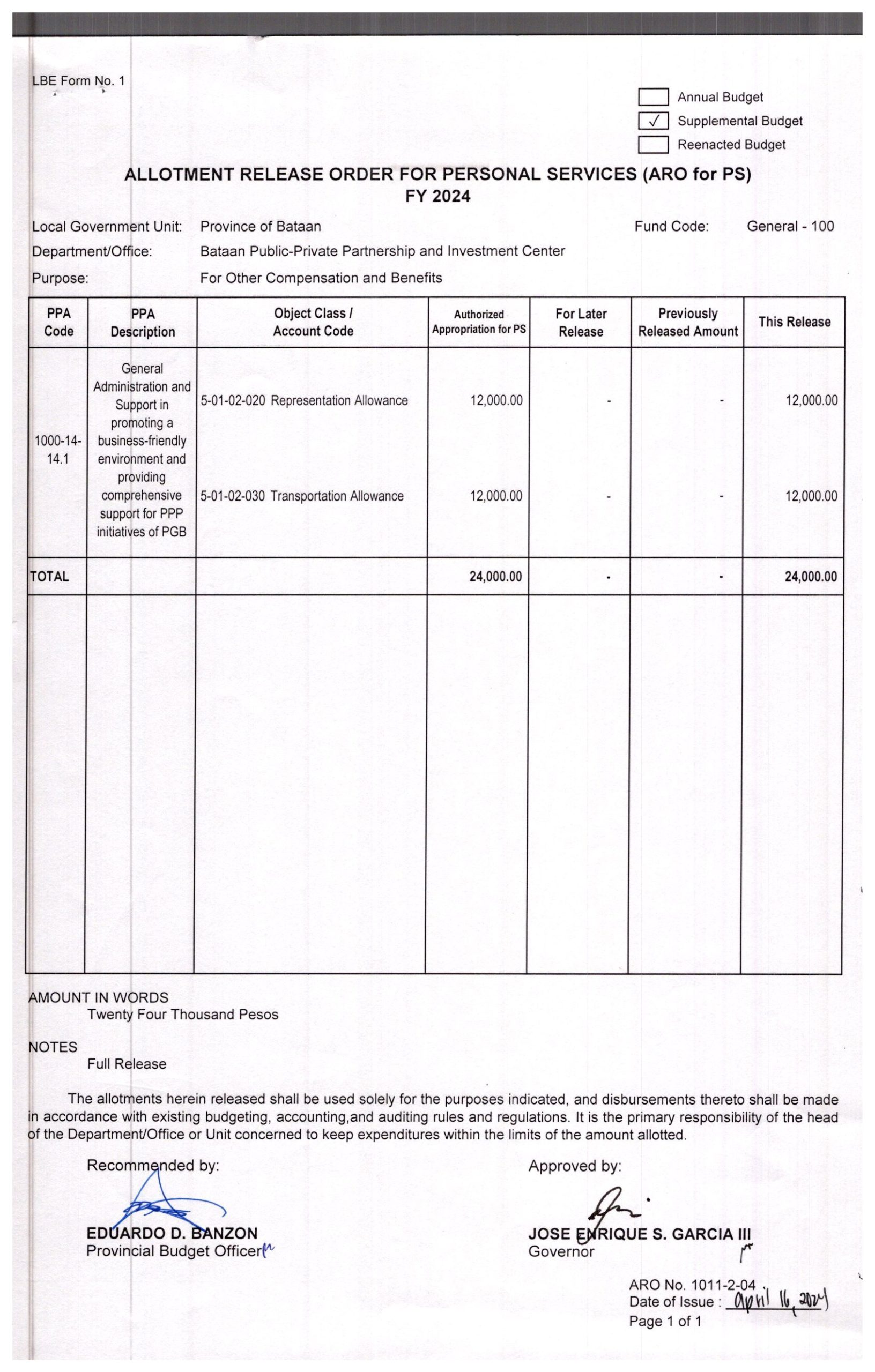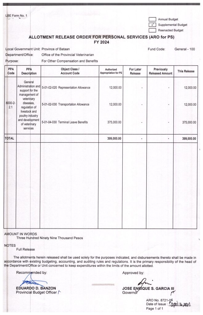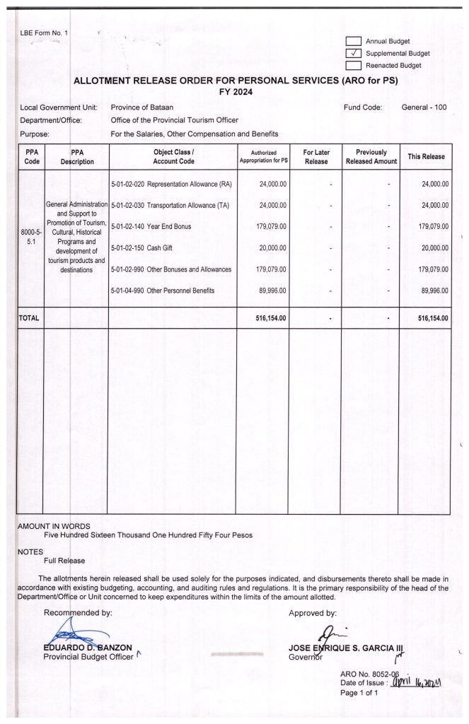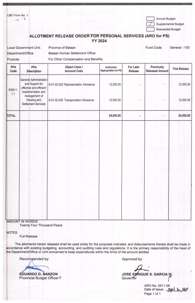 Allotment Release Order FY 2024 of Supplemental Budget No.2 FY 2024