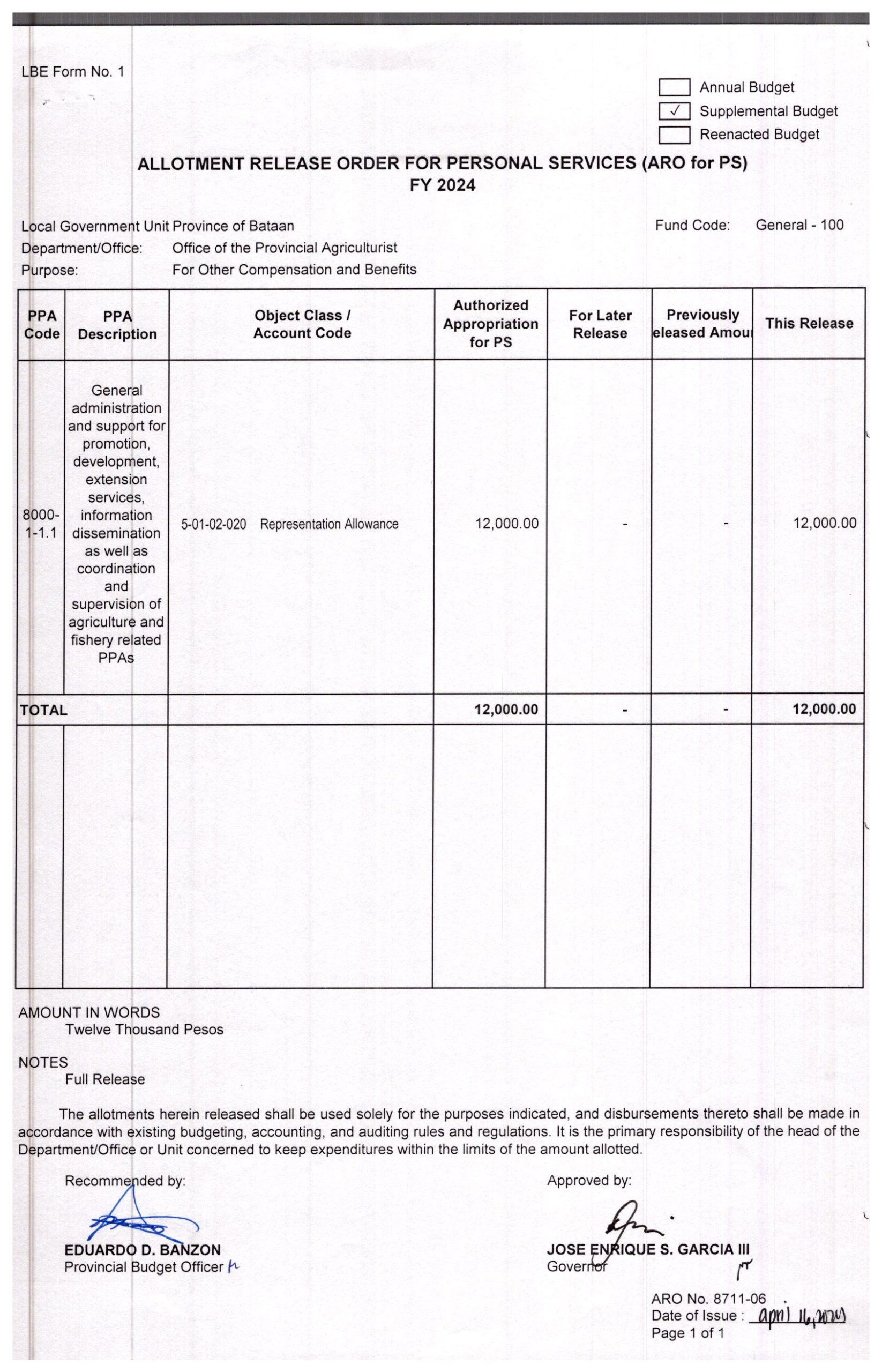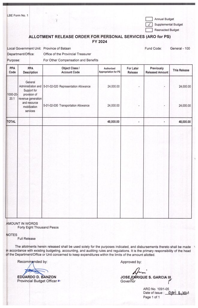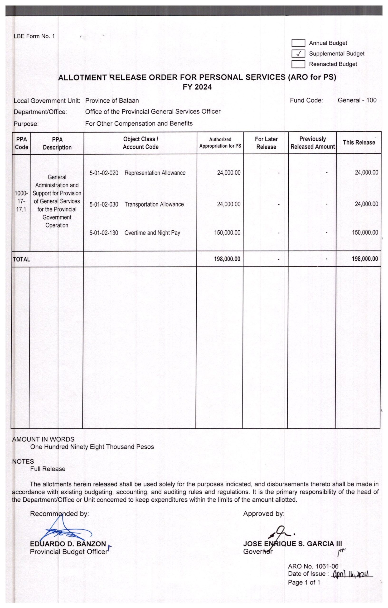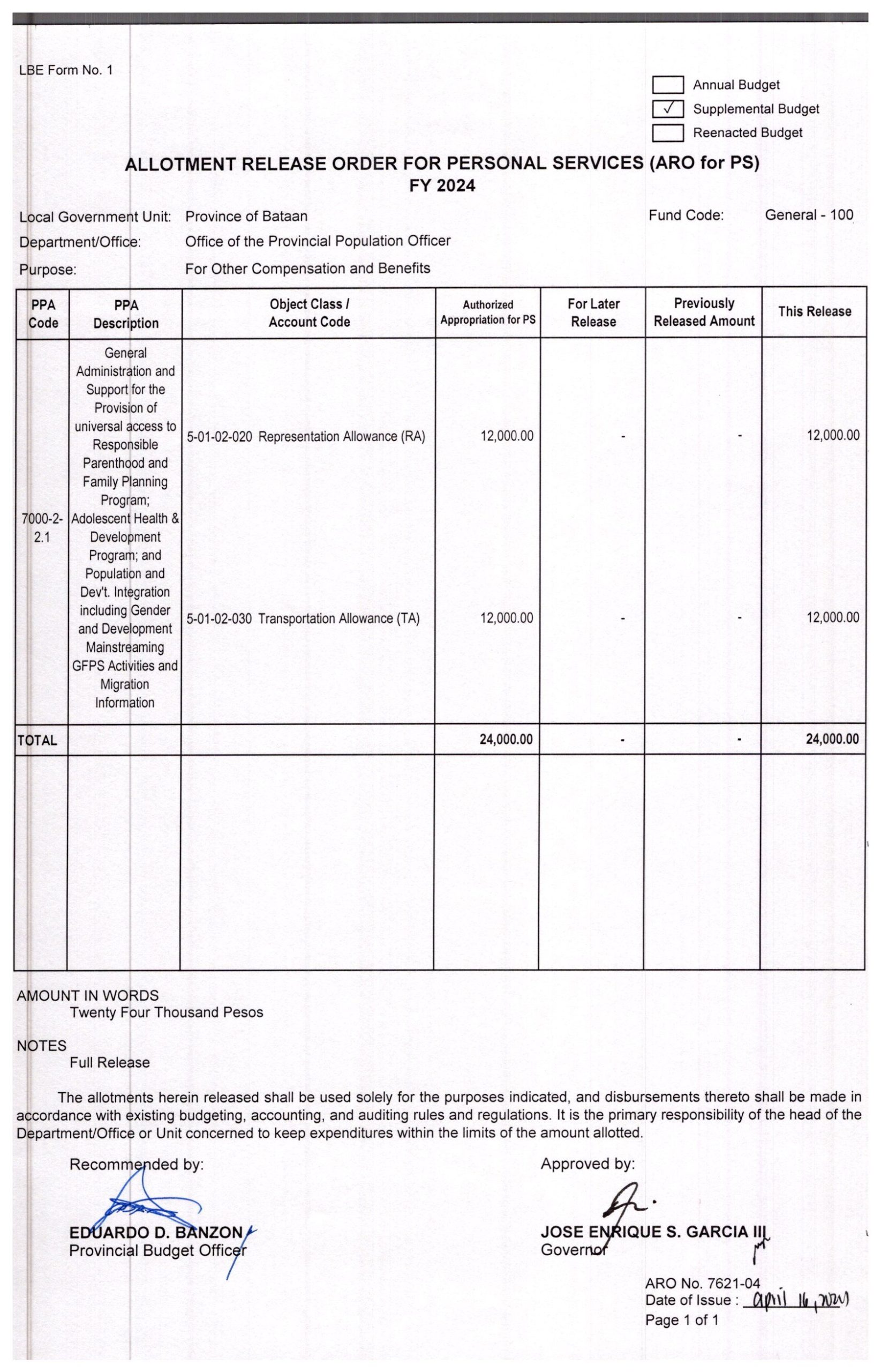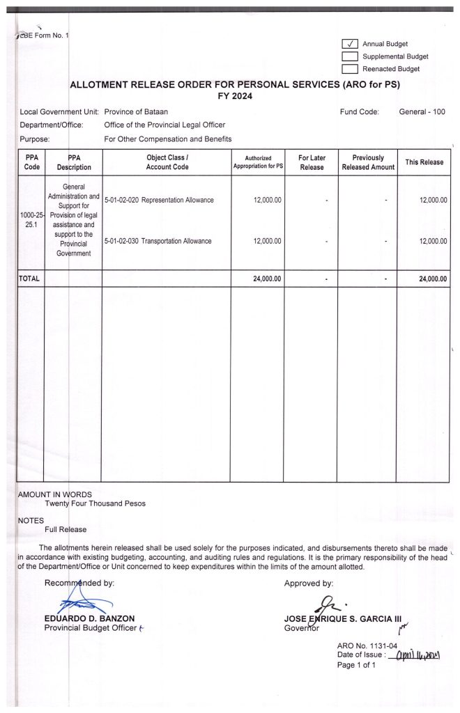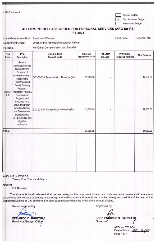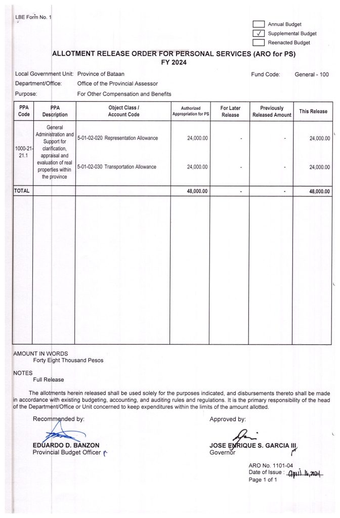 Allotment Release Order FY 2024 of Supplemental Budget No.2 FY 2024