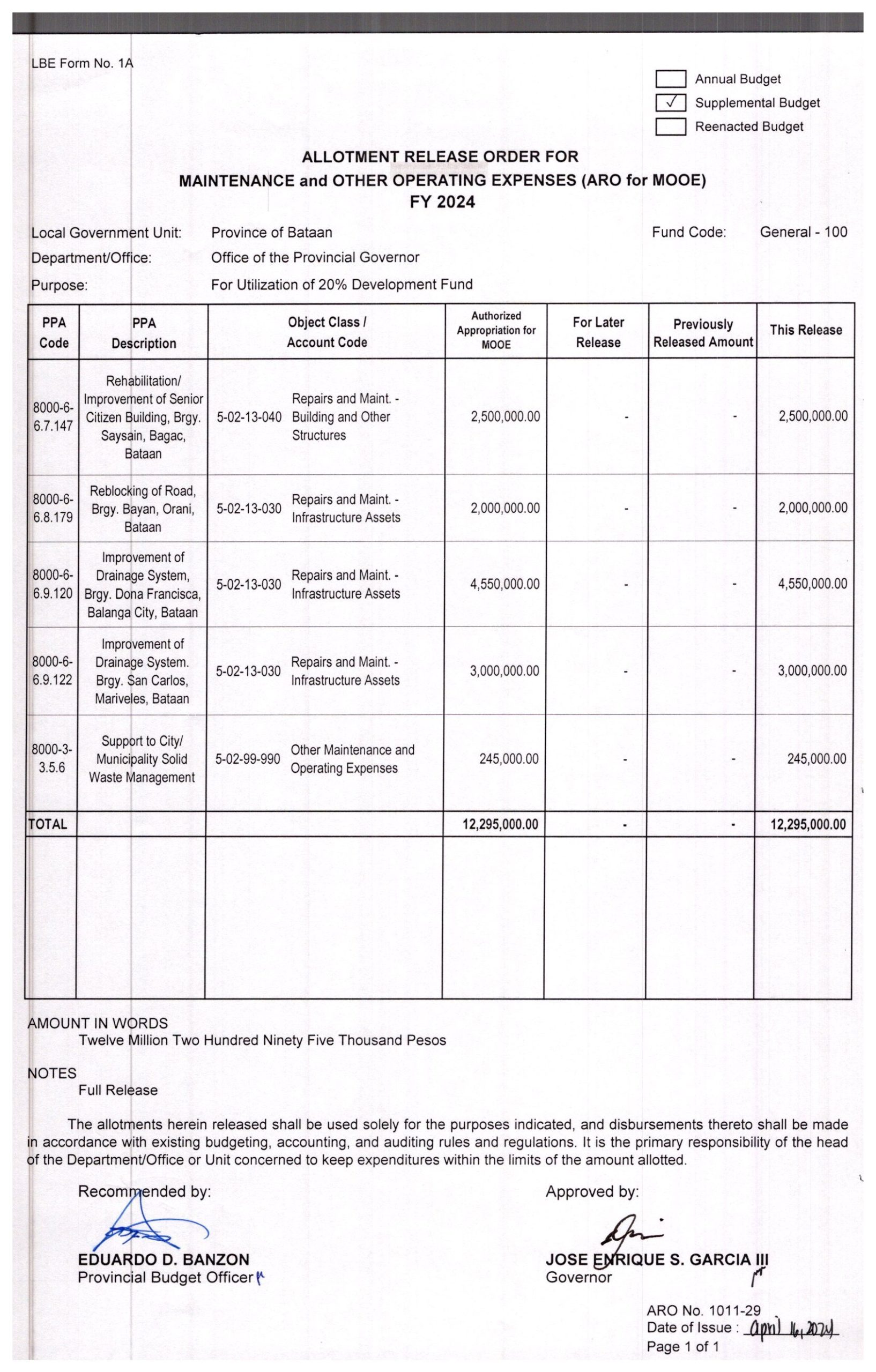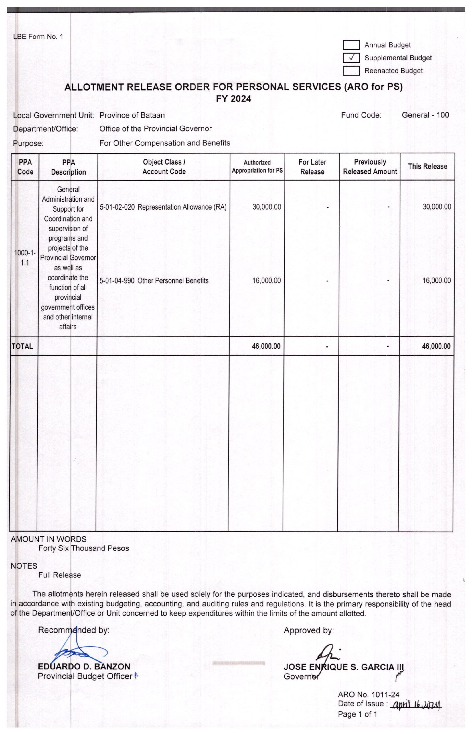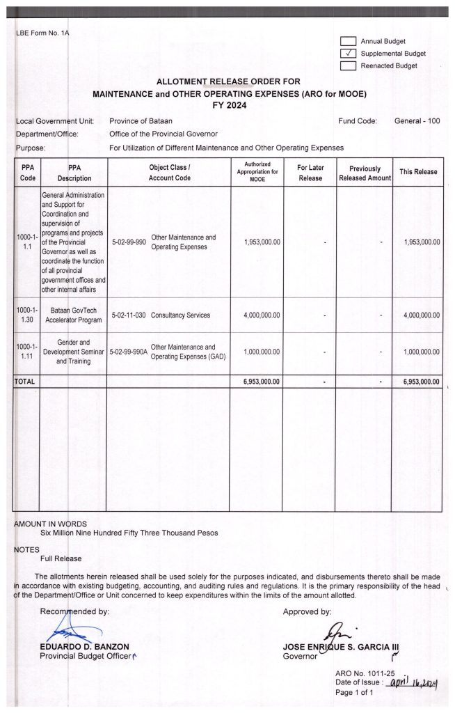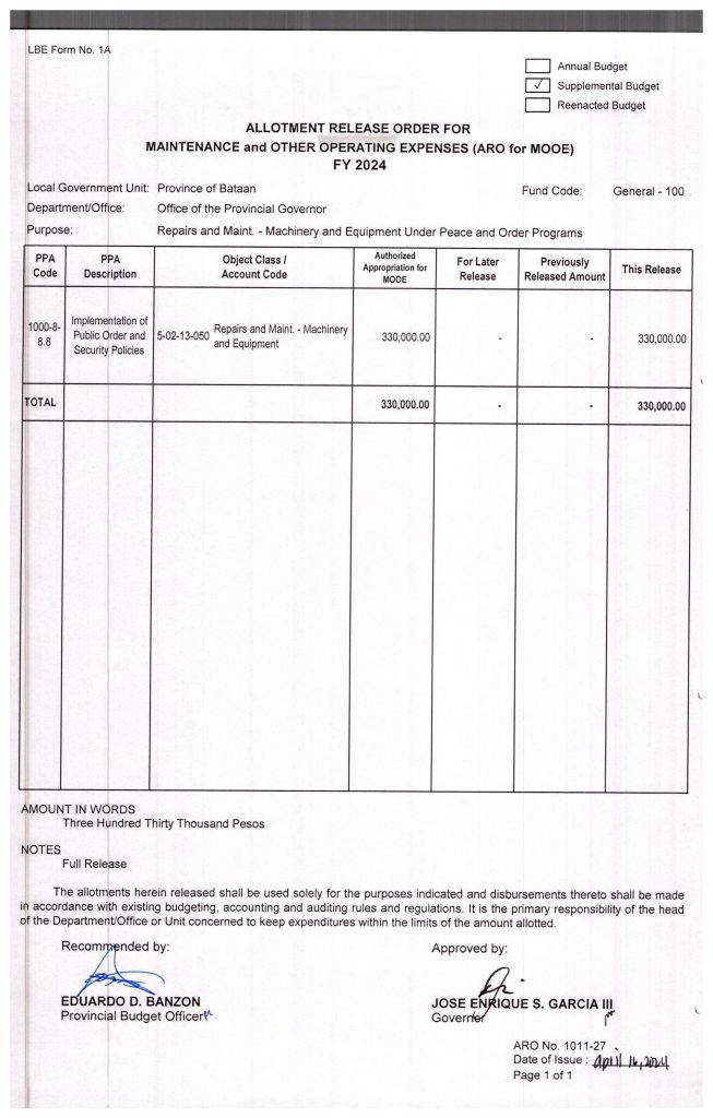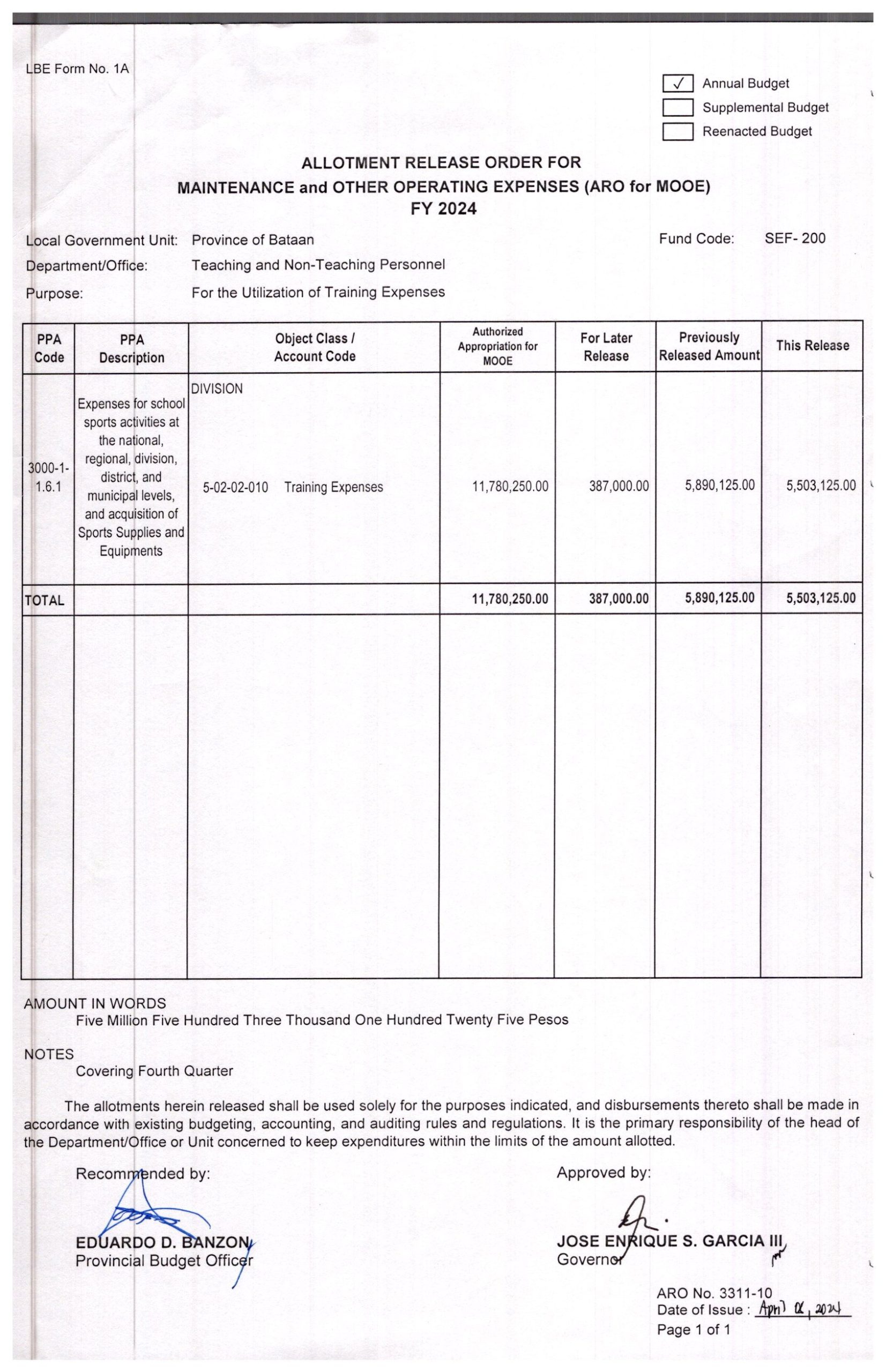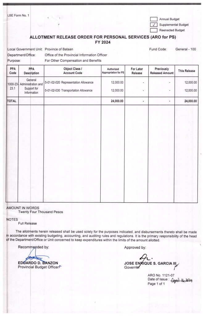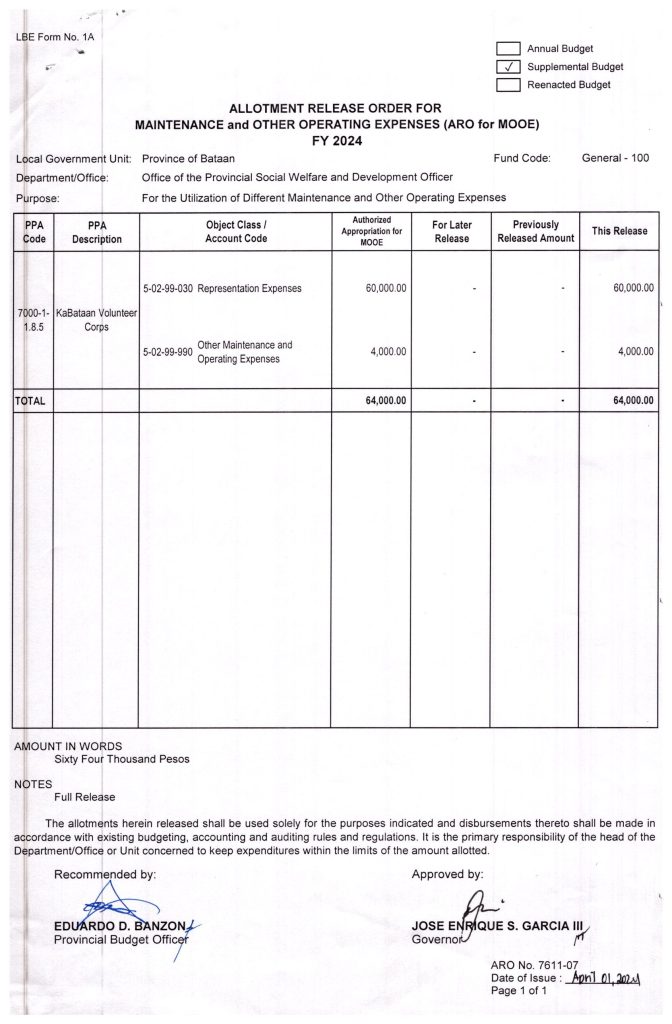 Allotment Release Order FY 2024 of Supplemental Budget No.2 FY 2024