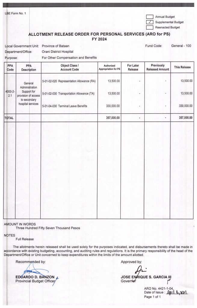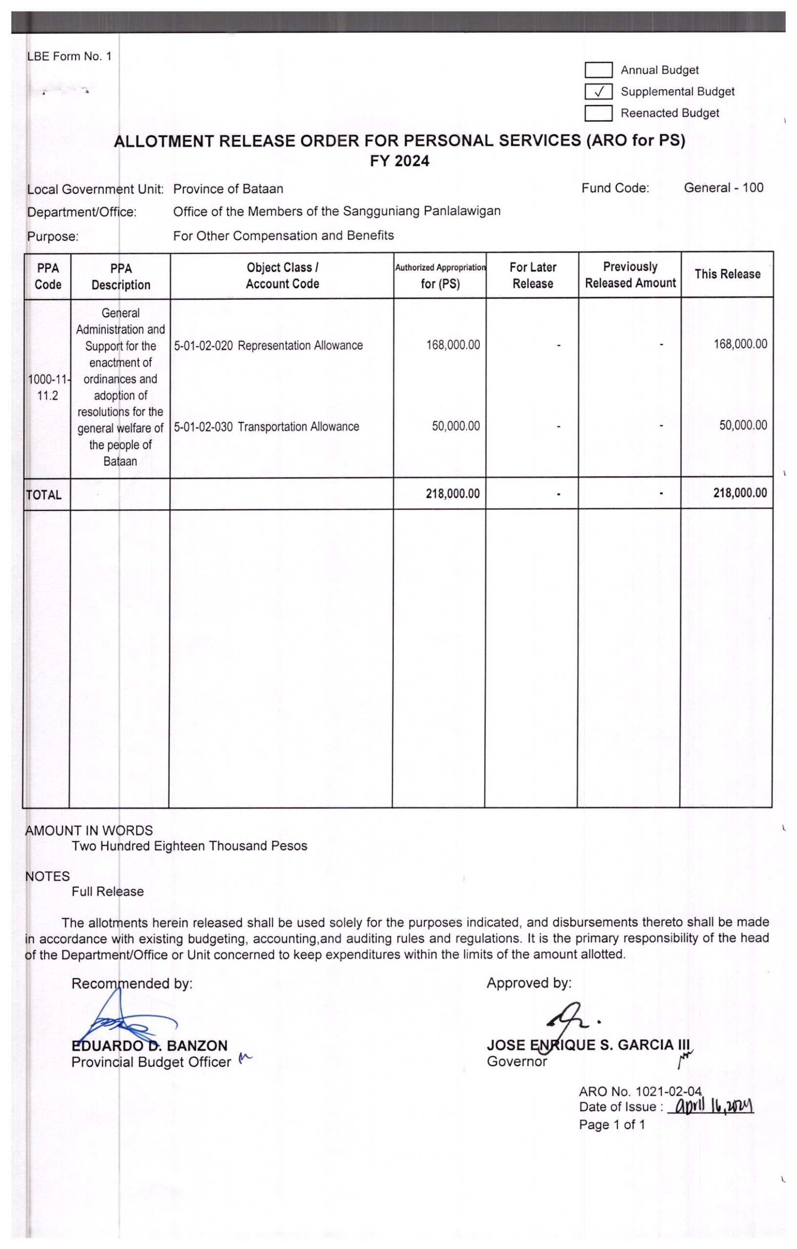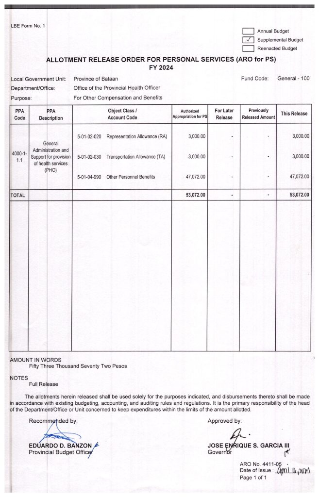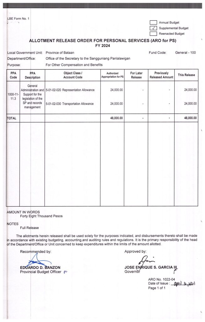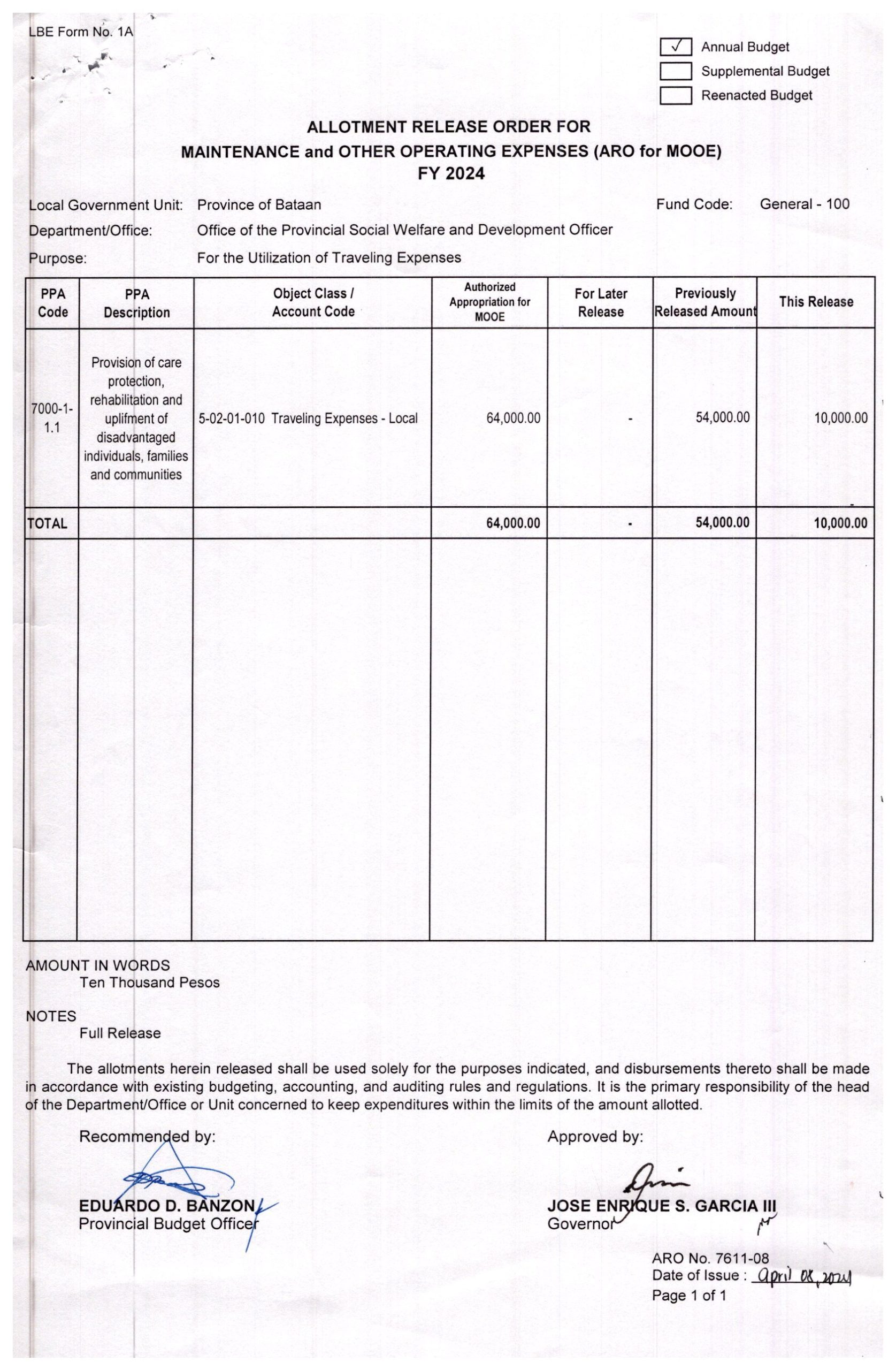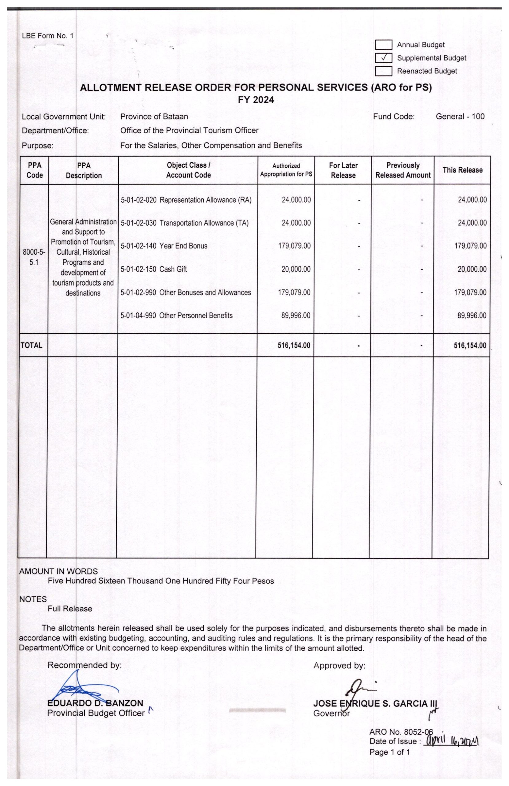 Allotment Release Order FY 2024 of Supplemental Budget No.2 FY 2024