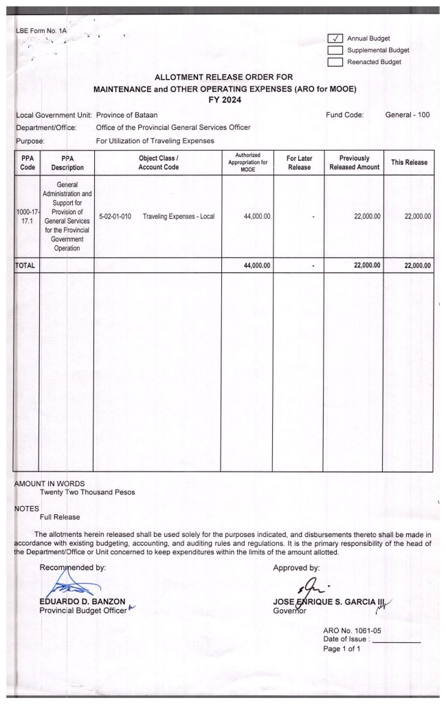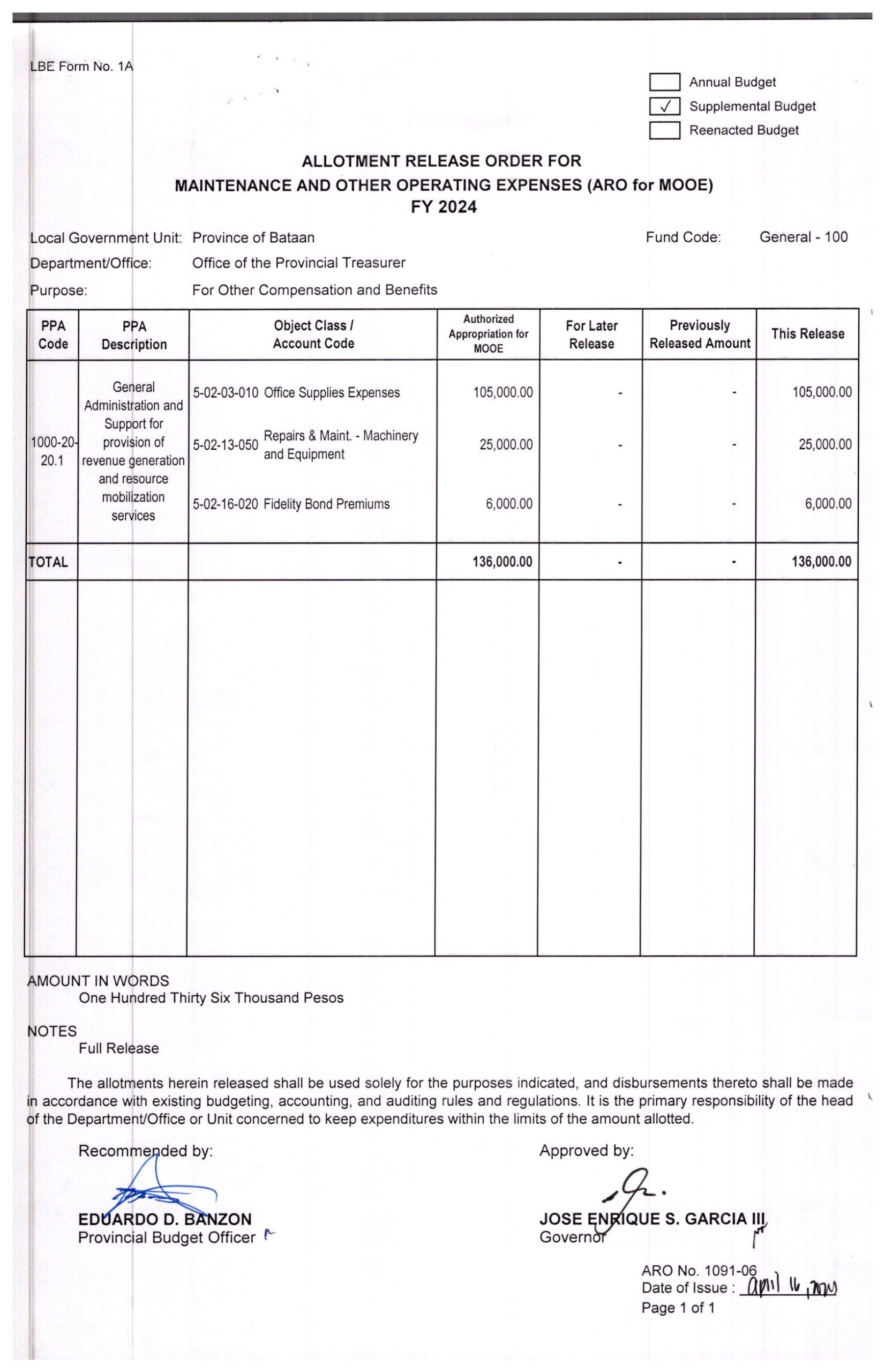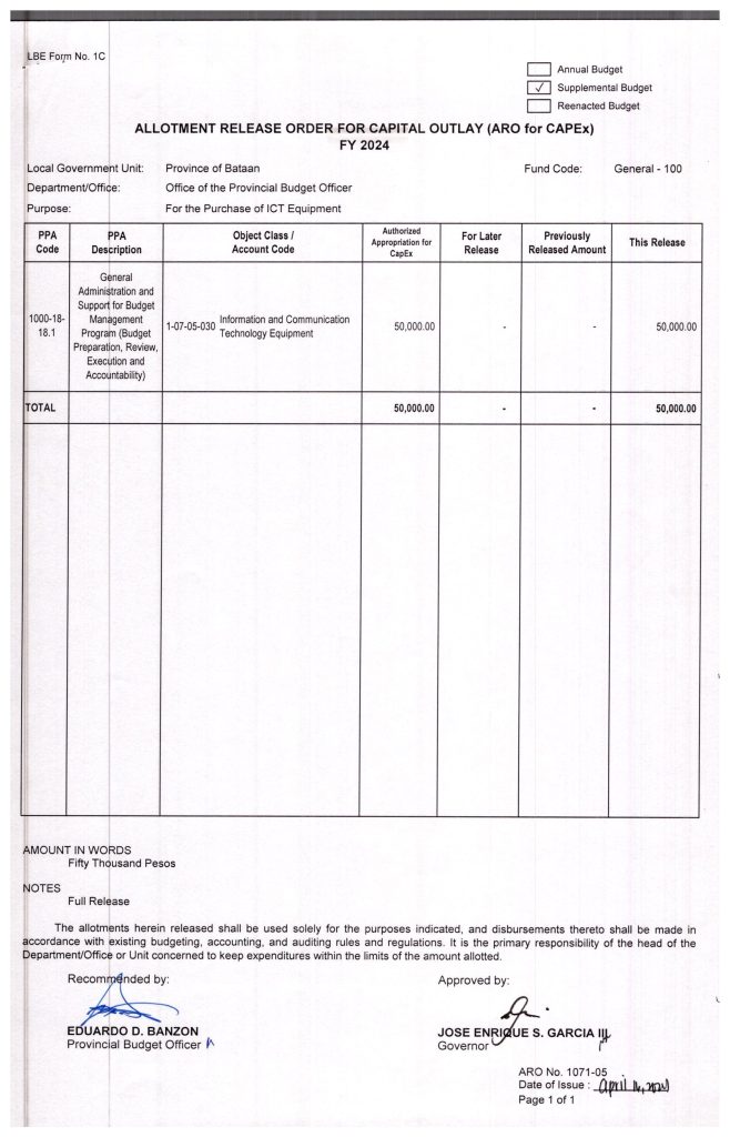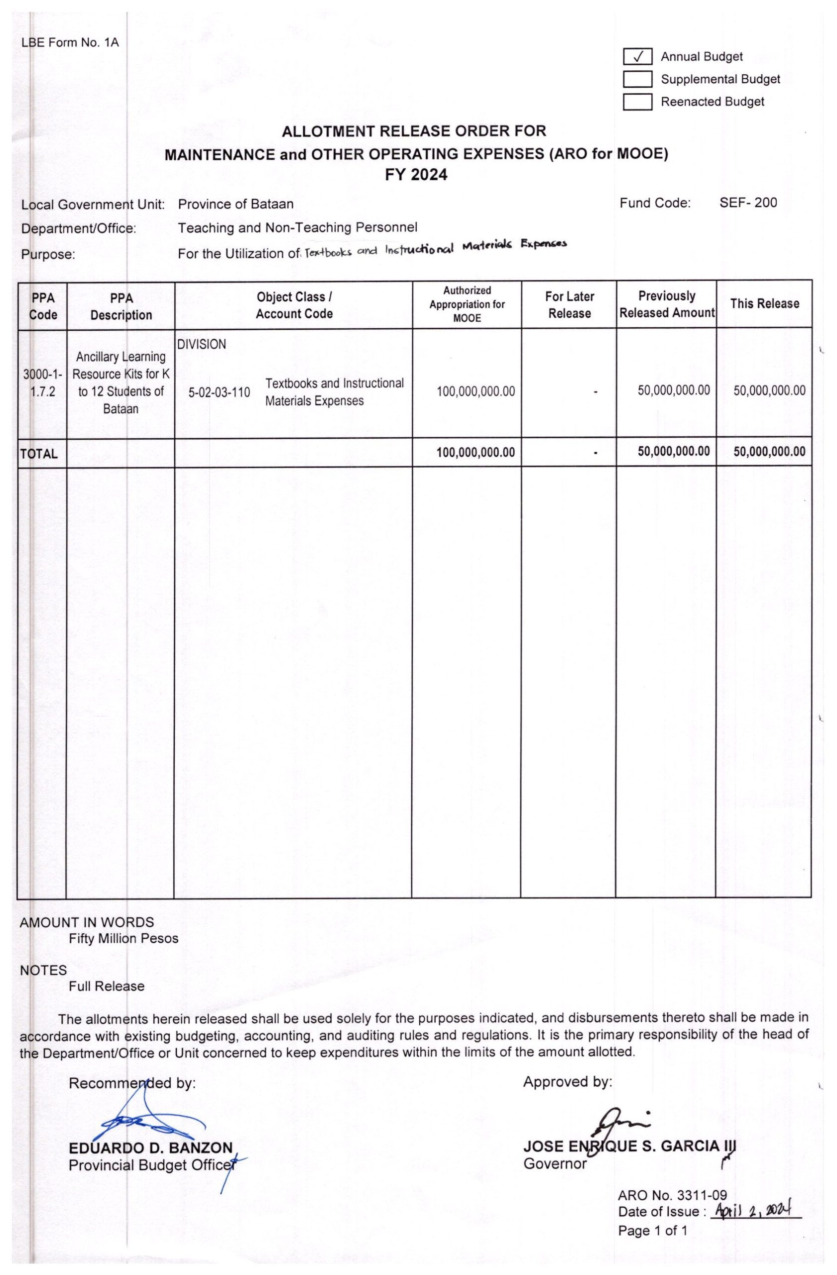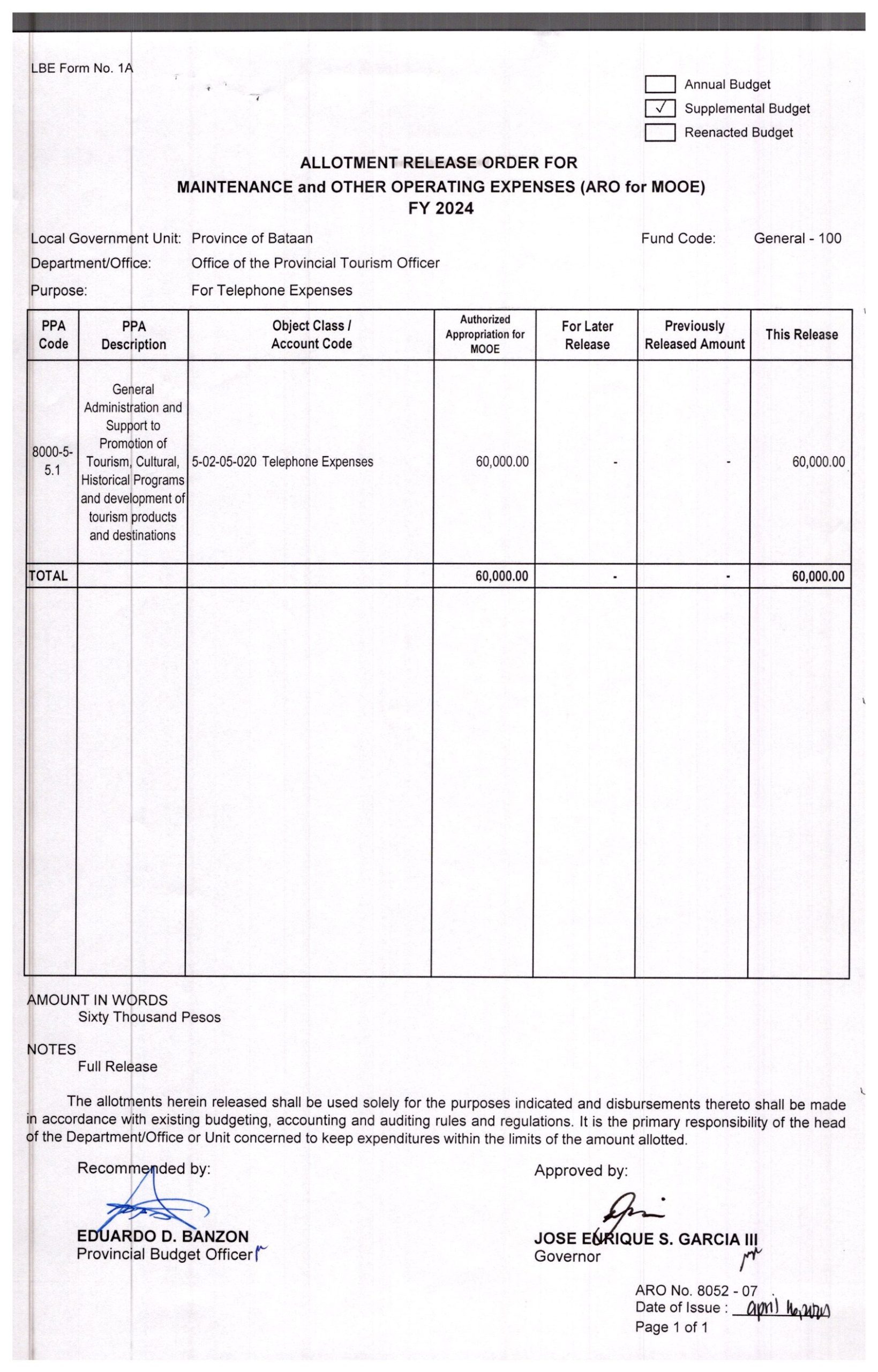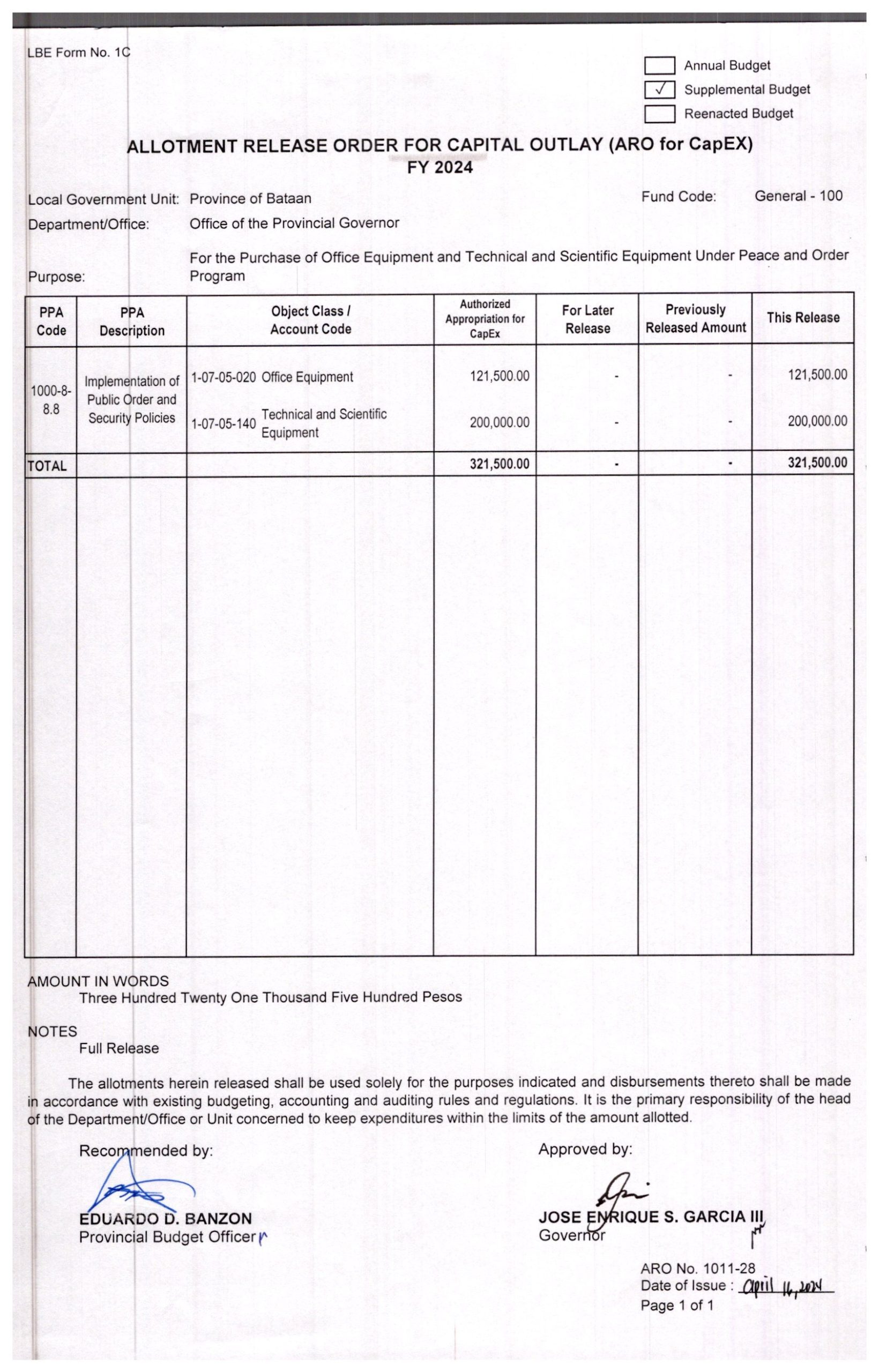 Allotment Release Order FY 2024 of Supplemental Budget No.2 FY 2024