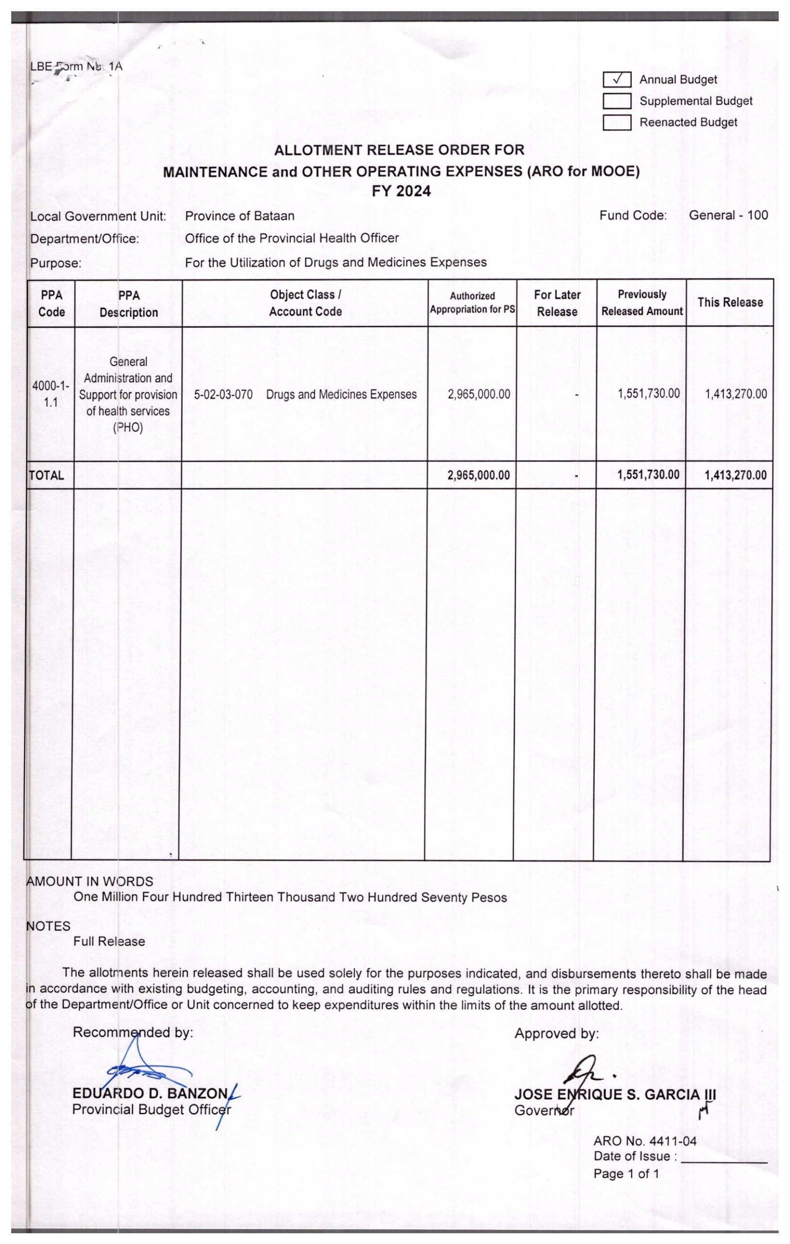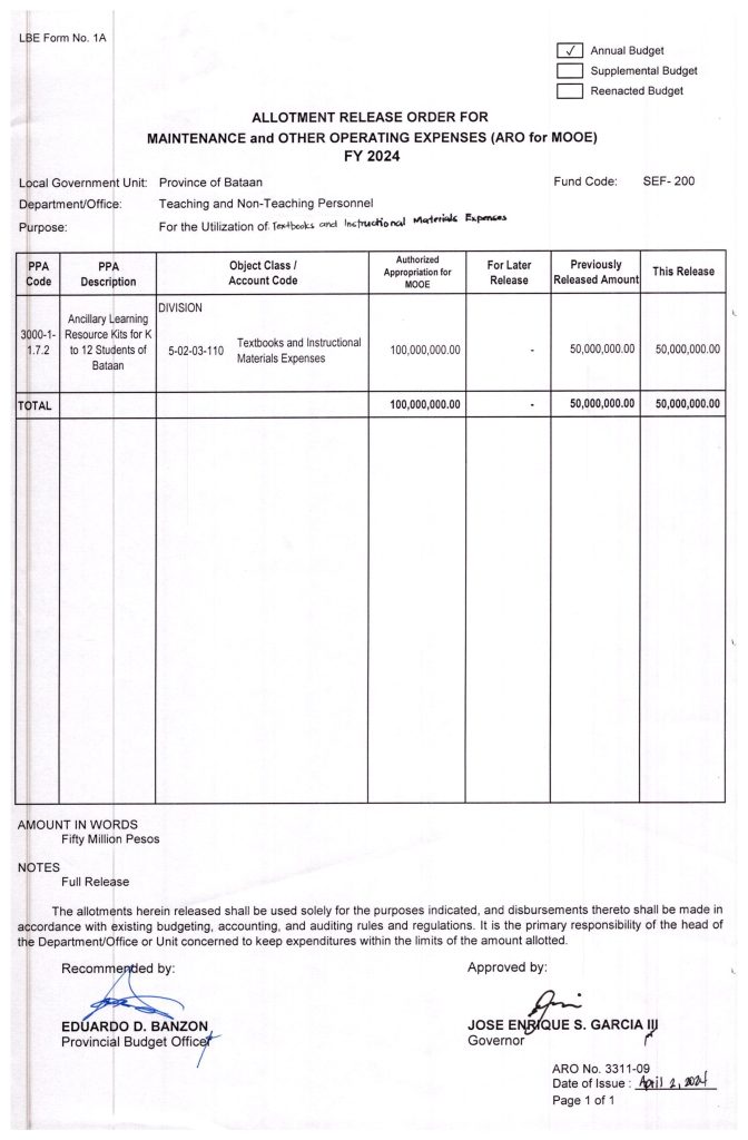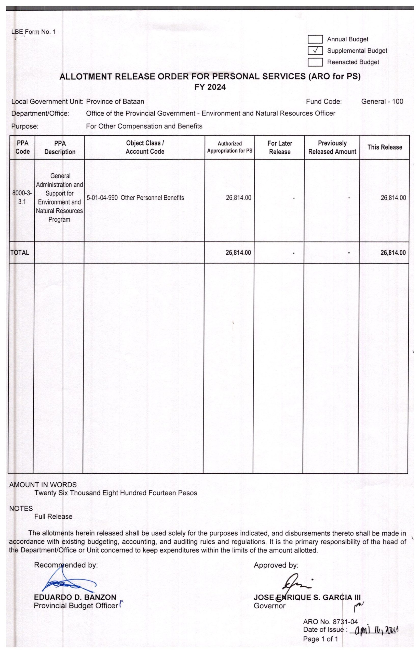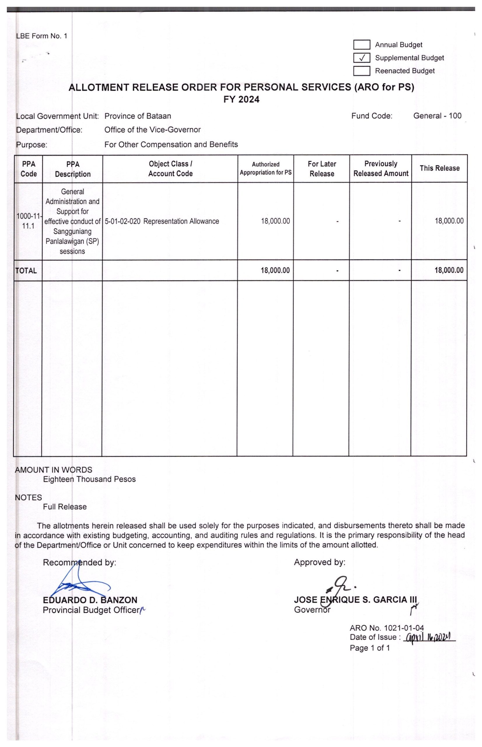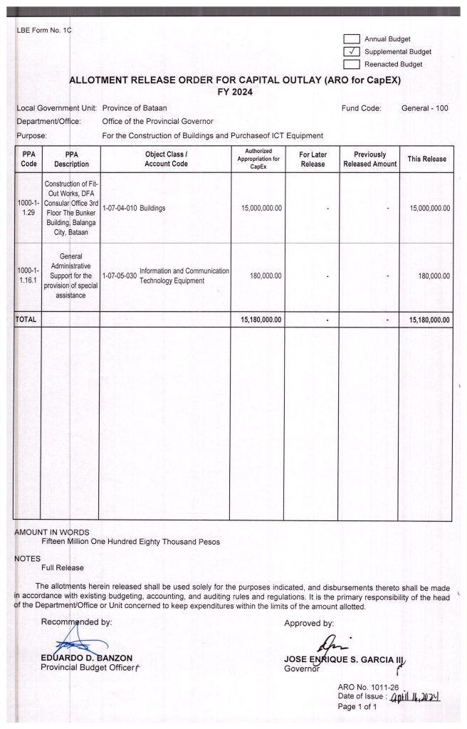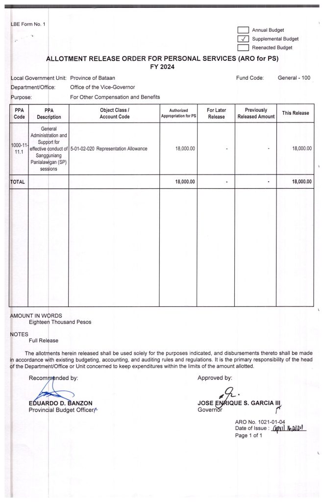 Allotment Release Order FY 2024 of Supplemental Budget No.2 FY 2024