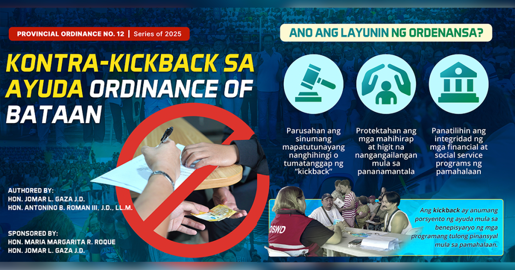 As financial assistance programs from the government continue to benefit residents in the province, Governor Joet Garcia reminded the public that asking for kickbacks or any form of commission/monetary share from beneficiaries is strictly prohibited under Provincial Ordinance No. 12, Series of 2025, also known as the Kontra-Kickback sa Ayuda Ordinance of Bataan.