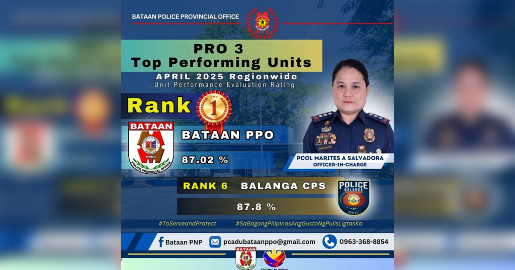 The Bataan Police Provincial Office (PPO) emerged as the top-performing provincial unit in the April 2025 Unit Performance Evaluation Rating (UPER) in Central Luzon, ranking first among nine provinces. Under the leadership of Officer-in-Charge PCOL Marites A. Salvadora, the unit was recognized for its excellence in law enforcement, community engagement, and crime prevention initiatives.