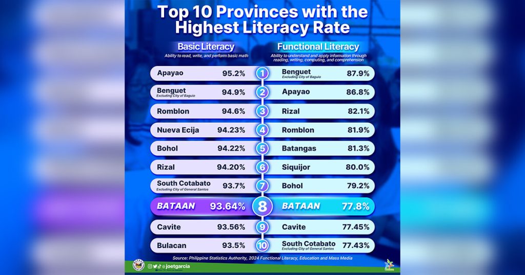 Bataan has emerged among the top-performing provinces in the country in terms of literacy after placing at the 8th spot nationwide in both basic and functional literacy in the 2024 Functional Literacy, Education and Mass Media Survey (FLEMMS) of the Philippine Statistics Authority (PSA).