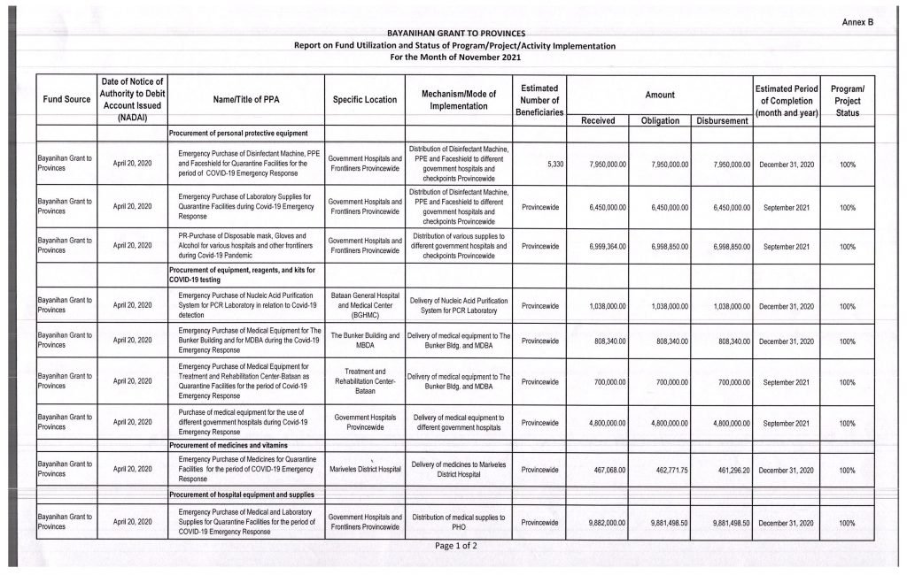 Report on fund utilization and status of program, project, and activity implementation for the month of November 2021