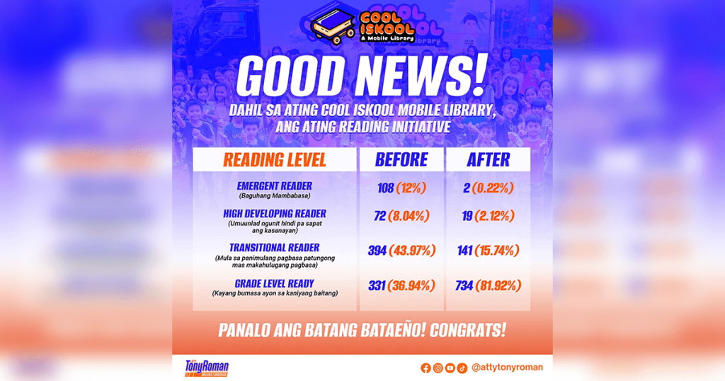 Bataan 1st District Congressman-elect Tony Roman said report from DepEd-Bataan shows Grade 3 pupils in the First District who benefitted from Cool Iskool Mobile Library project have significantly improved their reading skills based on the recent result of Comprehensive Rapid Literacy Assessment.