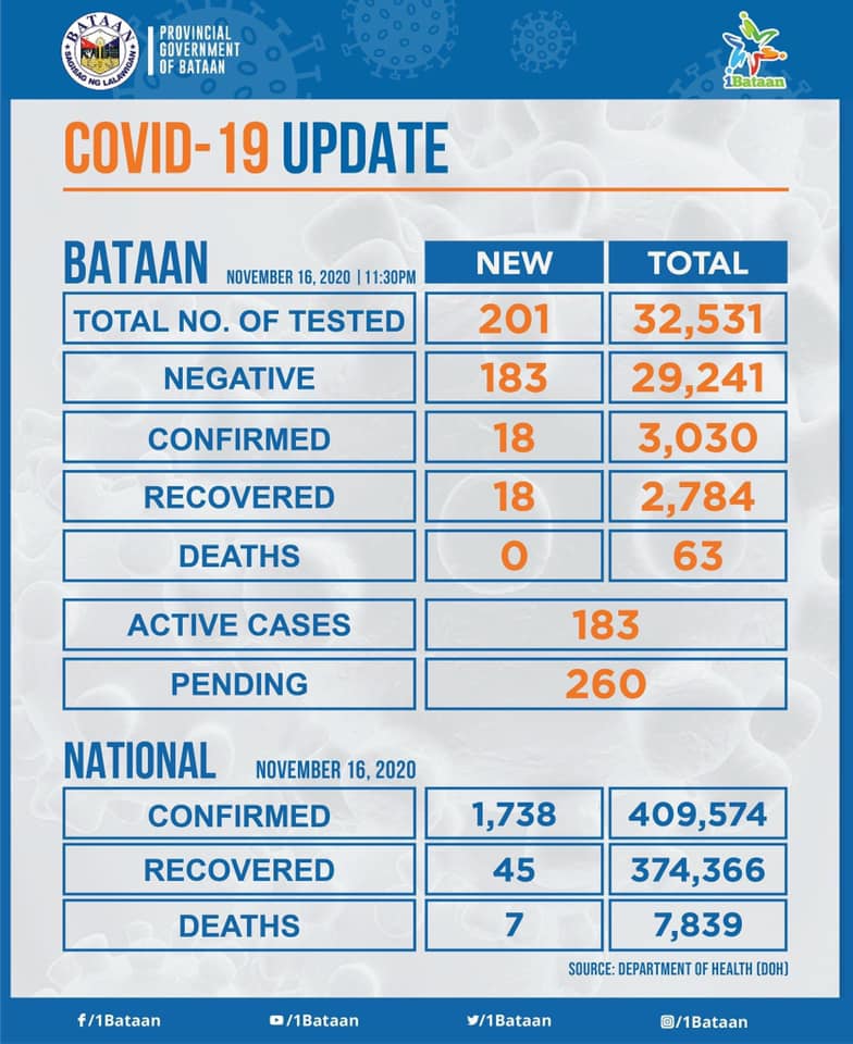 COVID-19 UPDATE: Sa huling ulat ng PHO kahapon, ika-16 ng Nobyembre, umabot na po sa 3,030 ang bilang ng mga nagpositibo sa COVID-19 sa ating Lalawigan, labing walo (18) ang mga bagong nakarecover at 183 ang nagnegatibo ang resulta ng test.