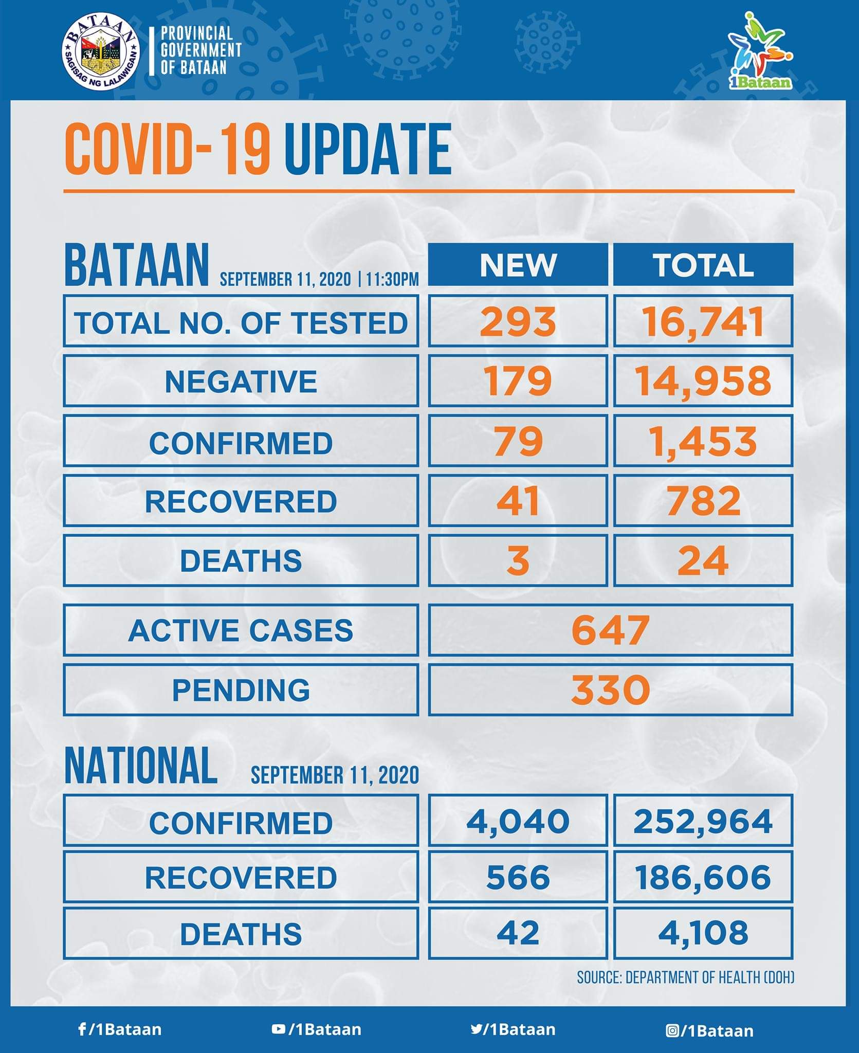 Sa huling ulat ng PHO kahapon, ika-11 ng Setyembre, umabot na po sa 1,453 ang bilang ng mga nagpositibo sa COVID-19 sa ating Lalawigan, apatnapu’t isa (41) ang mga bagong nakarecover at 179 ang nagnegatibo ang resulta ng test.