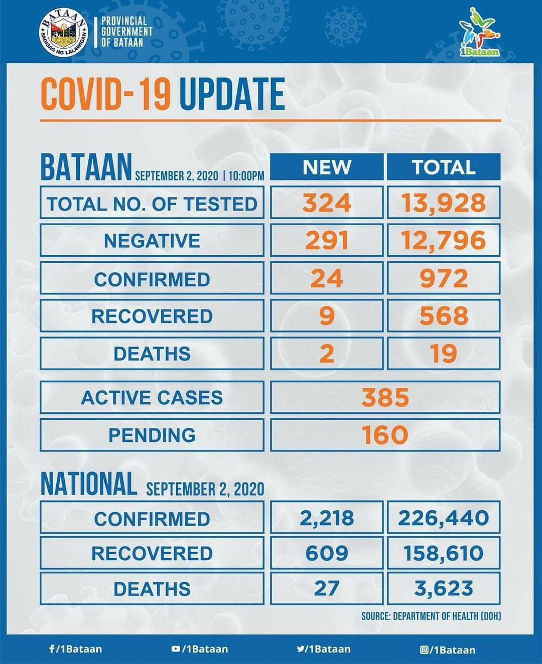 Labing siyam (19) na po ang bilang ng mga pumanaw. Ang dalawang bagong kaso ng pumanaw ay ang 69 na taong gulang na lalaki mula sa Pilar at ang 55 taong gulang na lalaki mula sa Hermosa. Ang bilang ng active cases ay 385; nasa 160 ang naghihintay ng resulta ng test; 12,796 ang nagnegatibo na at 324 ang mga bagong natest. Mula po noong ika-31 ng Enero hanggang sa kasalukuyan ay 13,928 na po ang natest sa ating Lalawigan.