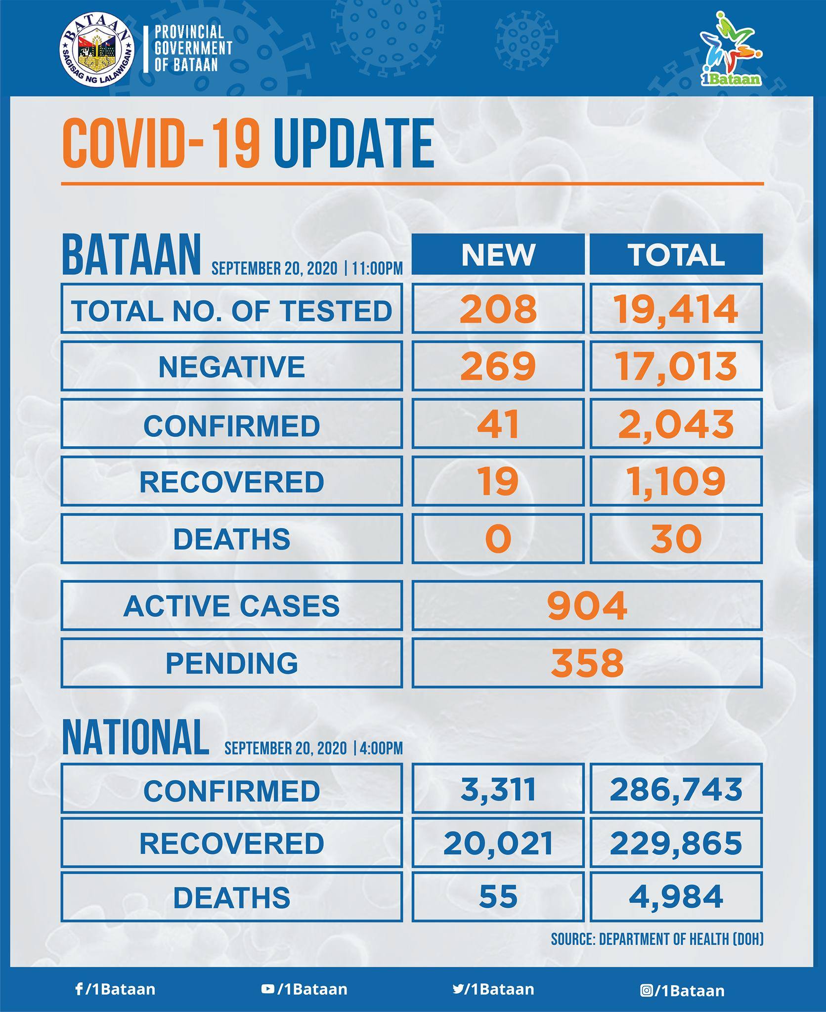 Ang kabuuang bilang ng active cases ay 904 at lahat sila ay naka isolate na; tatlumpu (30) ang pumanaw na; 358 ang naghihintay ng resulta ng test; 17,013 ang nagnegatibo na at 208 ang mga bagong natest. Mula po noong ika-31 ng Enero hanggang sa kasalukuyan ay 19,414 na po ang natest sa ating Lalawigan.