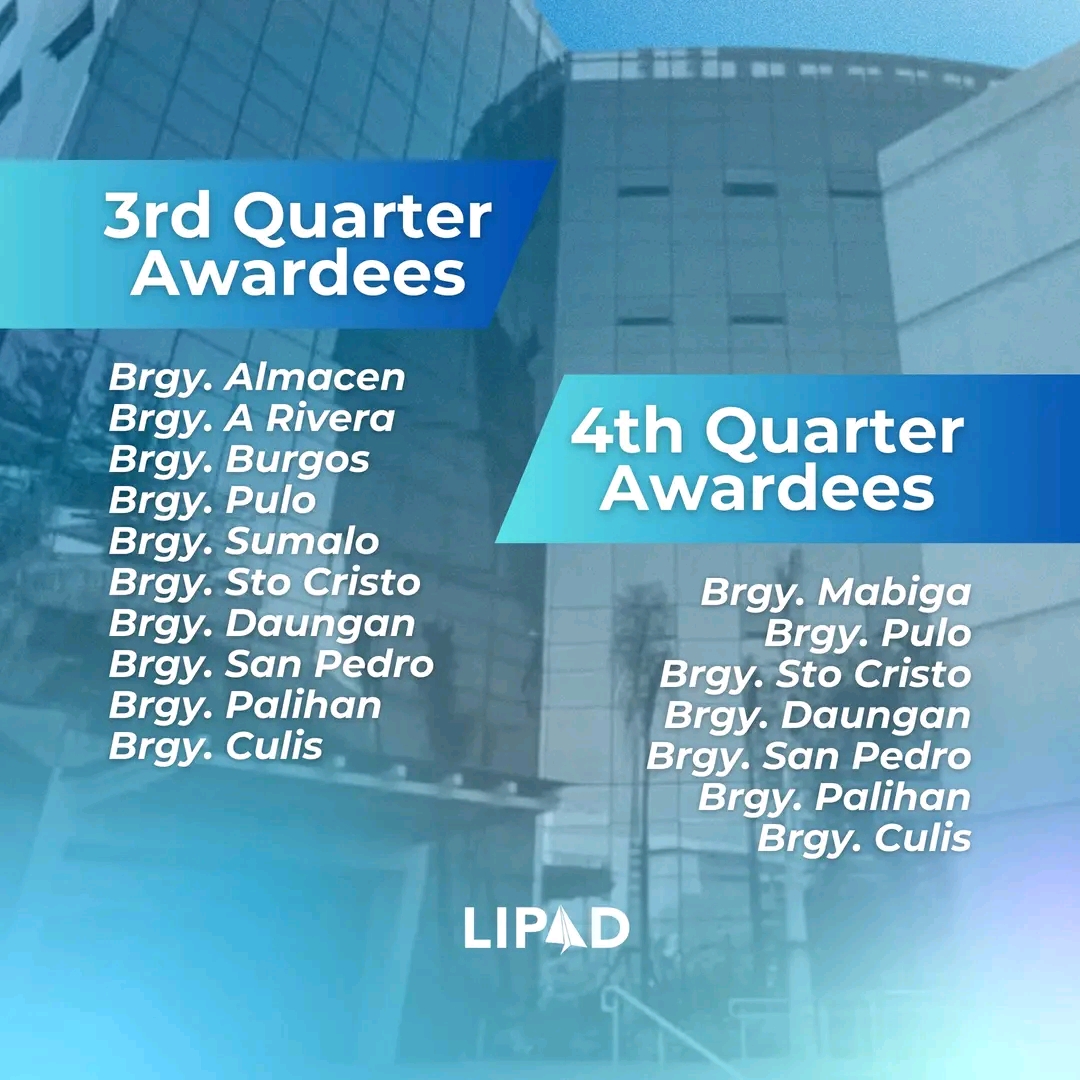 Meanwhile, the 4th Quarter awardees are Barangays Mabiga, Pulo, Sto. Cristo, Daungan, San Pedro, Palihan, and Culis.