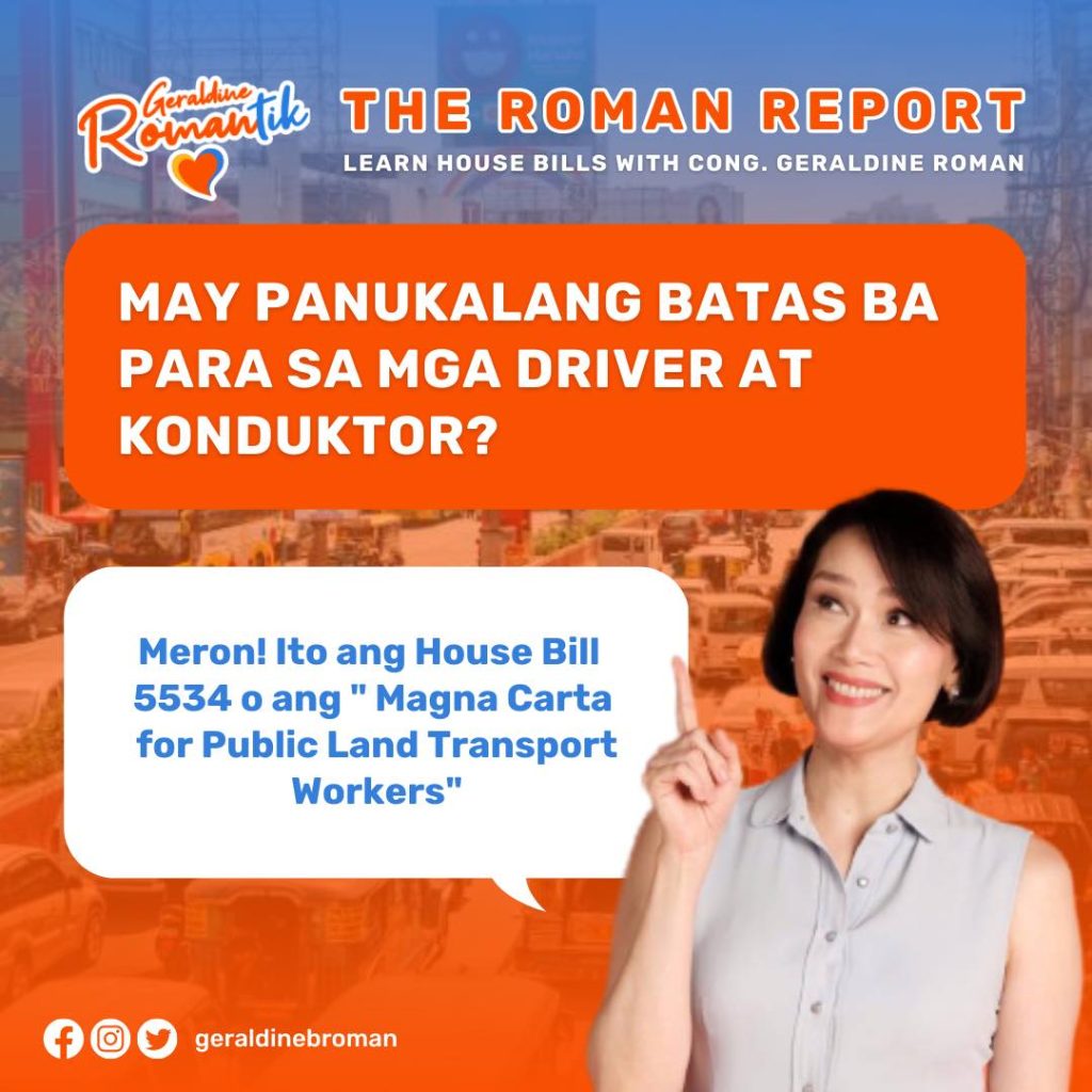 Bataan First District Representative Geraldine Roman has authored House Bill 5534 that seeks to provide better protection and benefits for land transport workers in the country through the Magna Carta for Land Transport Workers.