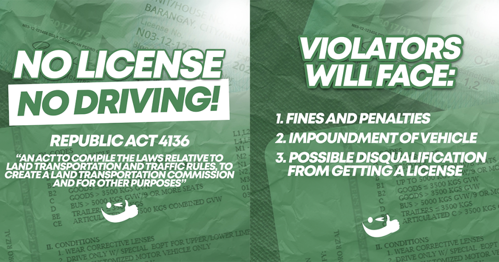 Under the Department of Transportation and Land Transportation Office’s Joint Administrative Order No. 2014-01, driving without a valid license is punishable by a ₱3,000 fine, confiscation of the vehicle, and up to a year’s ban from applying for a driver’s license.