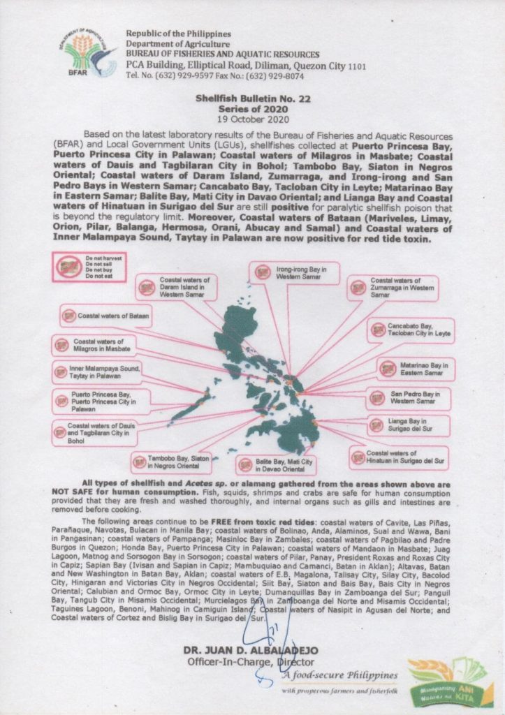 BFAR personnel found red tide toxin in the municipalities of Mariveles, Limay, Orion, Pilar, Hermosa, Orani, Abucay, and Samal, and the city of Balanga. BFAR warned the local folks against possible paralytic shellfish poisoning in the said areas.