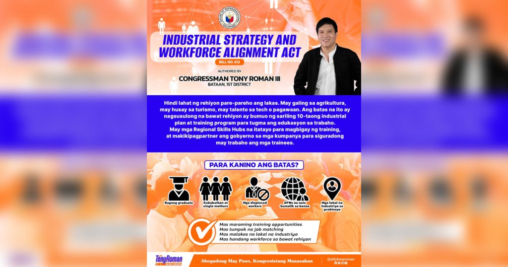Bataan 1st District Representative Tony Roman III has authored House Bill 612, or the Industrial Strategy and Workforce Alignment Act, a measure that seeks to align skills training with the unique economic strengths of every region in the Philippines.