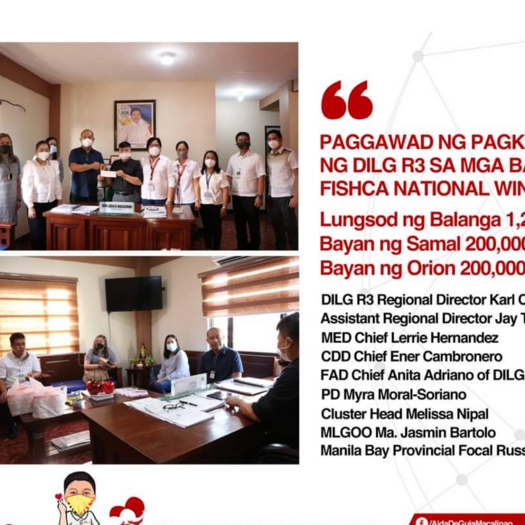 Iginawad ang pagkilala para sa mga FISHCA national winners sa pagbisita ng mga opisyal sa mga nanalong bayan kasama sina DILG R3 Regional Director Karl Ceasar Rimando, DILG Asst. Director Jay Timbreza, MED Chief Lerrie Hernandez, CDD Chief Ener Cambronero, FAD Chief Anita Adriano ng DILG R3, PD Myra Moral-Soriano ng Bataan, Cluster head Melissa Nipal, Samal MLGOO Ma. Jasmin Bartolo at Manila Bay Focal person Russel Jasper Rabacio.