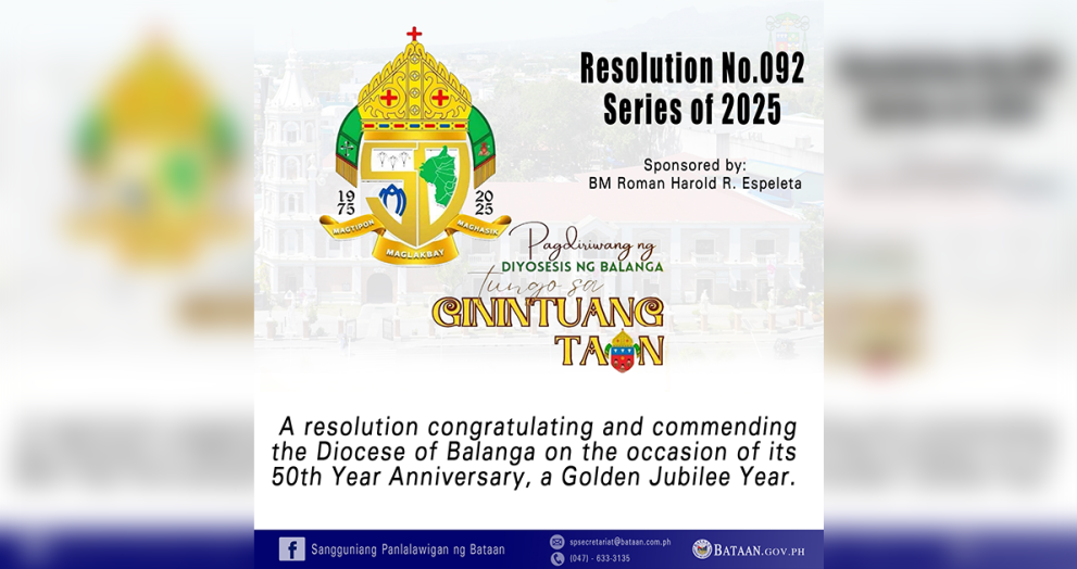 The Sangguniang Panlalawigan (SP) ng Bataan led by Vice Gov. Cris Garcia has passed a resolution congratulating and commending the Diocese of Balanga on its 50th Year Anniversary. SP  expressed its appreciation for the clergy, religious leaders, and faithful who have played a pivotal role in fostering spiritual growth and community development over the past […]