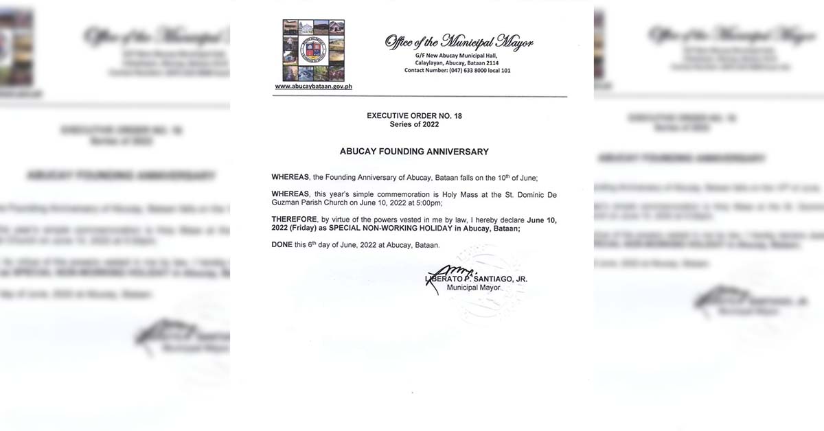 Idineklara ngayon ni Abucay Mayor Liberato P. Santiago Jr. ang Hunyo 10, 2022 bilang isang non-working holiday kaugnay ng pagdiriwang ng Abucay Founding Anniversary sa nabanggit na petsa. Ang simpleng komemorasyon ay gaganapin sa pamamagitan ng pagdaraos ng isang Banal na Misa sa St. Dominic De Guzman Parish Church ganap na alas 5 ng hapon. […]