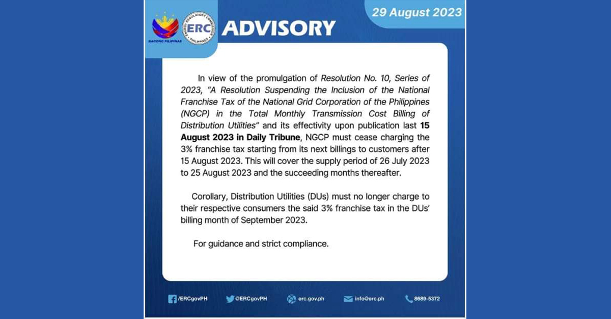 The Peninsula Electric Cooperative (Penelco) announced on its social media page that it will no longer charge the 3% franchise tax to its consumers starting from the billing month of September 2023. Their statement states that this is in compliance with Resolution No. 10, Series of 2023, issued by the Energy Regulatory Commission (ERC) on […]