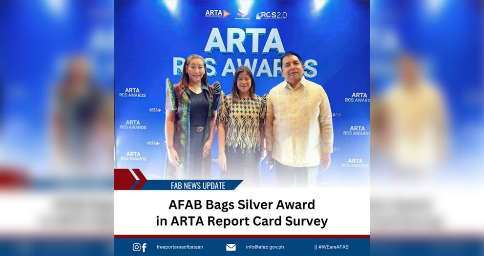 The Authority of the Freeport Area of Bataan (AFAB) has earned a Silver Award from the Anti-Red Tape Authority (ARTA) after receiving a “Very Satisfactory” rating in the 2024 Report Card Survey (RCS) 2.0, recognizing its strong adherence to the Ease of Doing Business (EODB) Law and efficient service delivery.   The award was formally […]