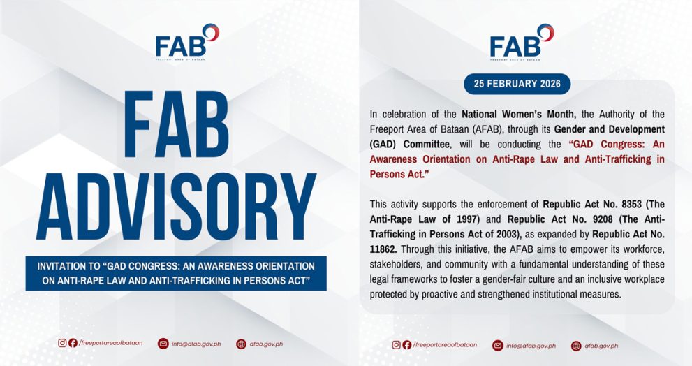 The Authority of the Freeport Area of Bataan (AFAB) in partnership with the Department of Social Welfare and Development (DSWD) and Dong-In Sunbirds Corp., launched a Skills Development Training Program. The first batch of 14 trainees will undergo 7 to 12 days of hands-on training to enhance their technical competencies preparing them for employment […]